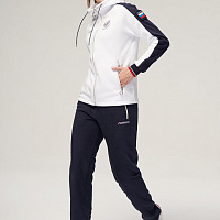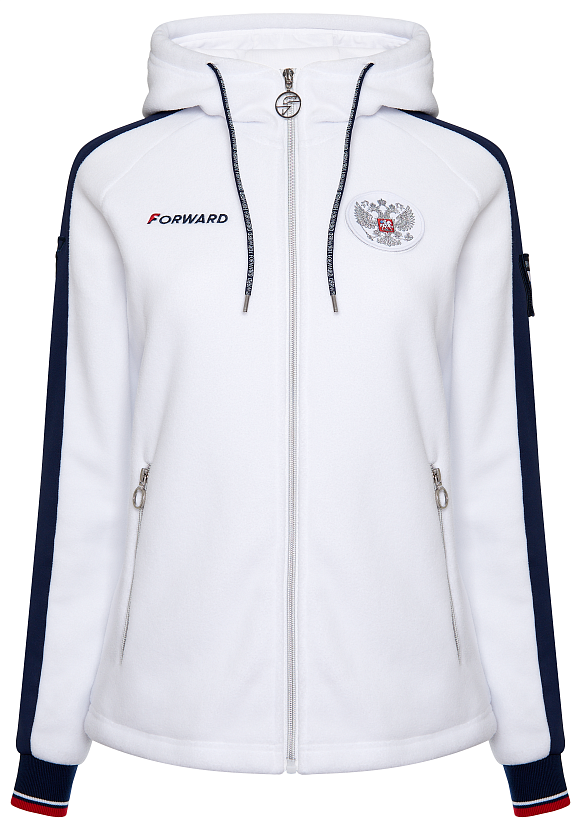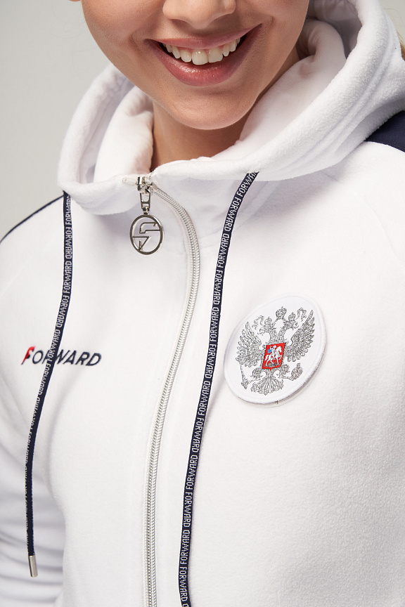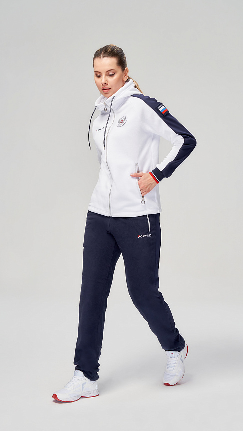 Куртка прямого силуэта с капюшоном. Полочка с центральной застежкой на тесьму молнию. Боковые карманы прорезные обработаны с тесьмой молнией. Капюшон регулируется по высоте с помощью шнурка. Рукава покроя реглан.На рукавах декоративные вставки из ламинированного флиса. Манжеты выполнены из трикотажного полотна ластик. Низ изделия регулируется при помощи эластичного шнура и фиксаторов. Нанесения на куртке: Жаккардовый шеврон «Герб РФ», жаккардовый шеврон«Флаг РФ», вышивка «FORWARD», принт «Мы вместе.спорт» Брюки слегка зауженного к низу силуэта. Боковые карманы прорезные, застегиваются на молнию. Вдоль боковых швов декоративныевставки из ламинированного флиса. Пояс с эластичной тесьмой. Ширина пояса регулируется шнуром, вставленным внутрь. Ширина по низу регулируется при помощи эластичного шнура и фиксаторов. Нанесения на брюках: вышивка «FORWARD». Состав: ткань верха 100% полиэстер 240г/м², флис с двусторонним подчесом, полотно компаньон 100% полиэстер 240г/м², ламинированный флис.