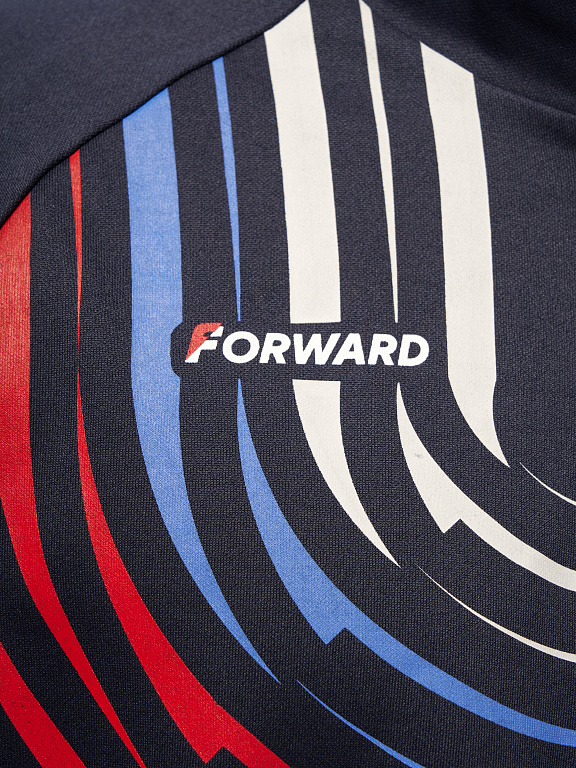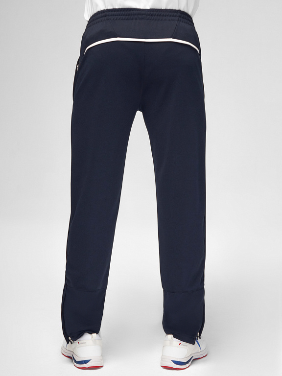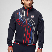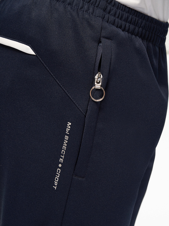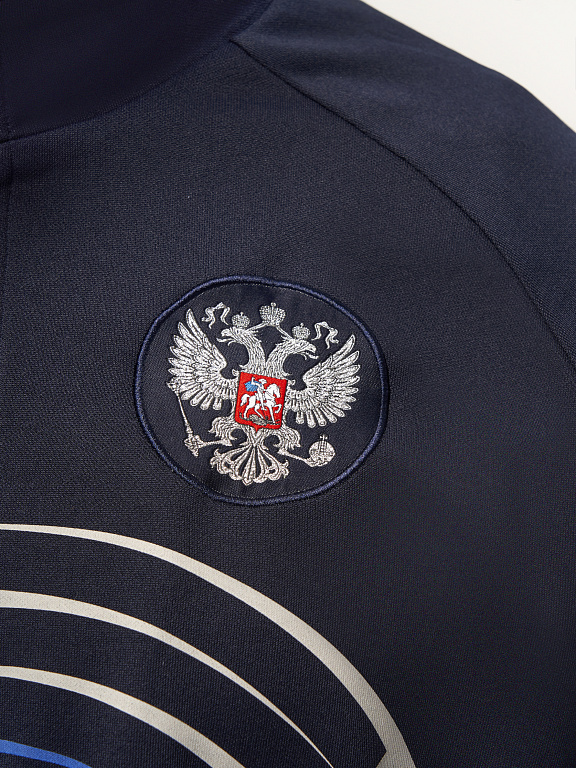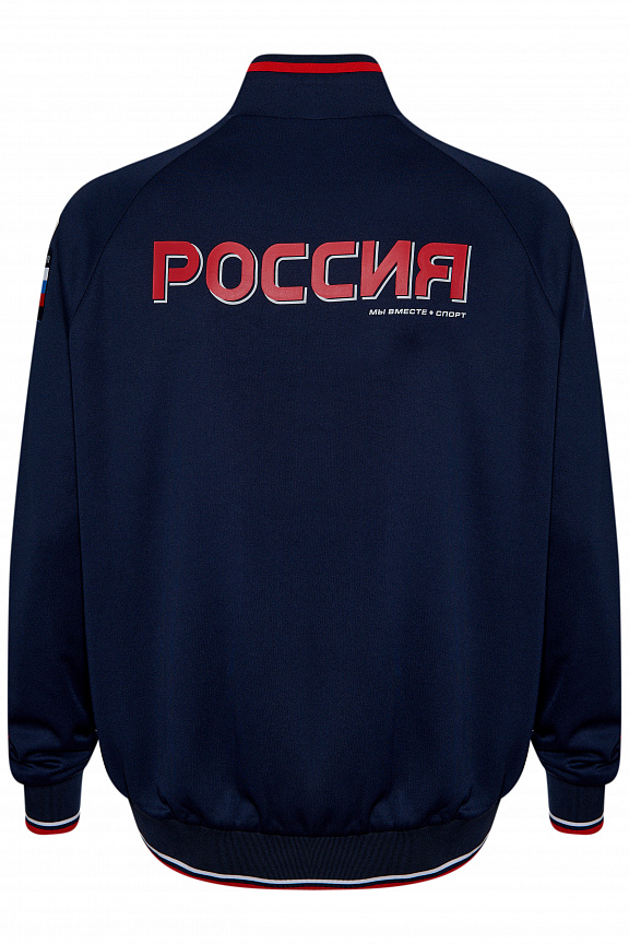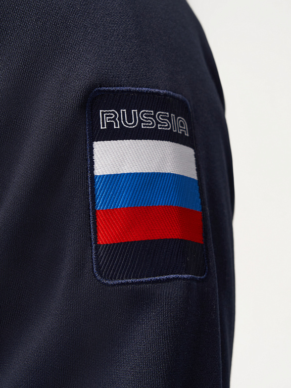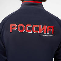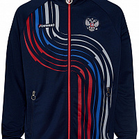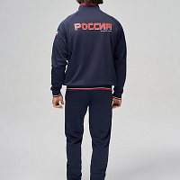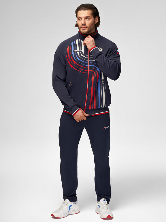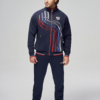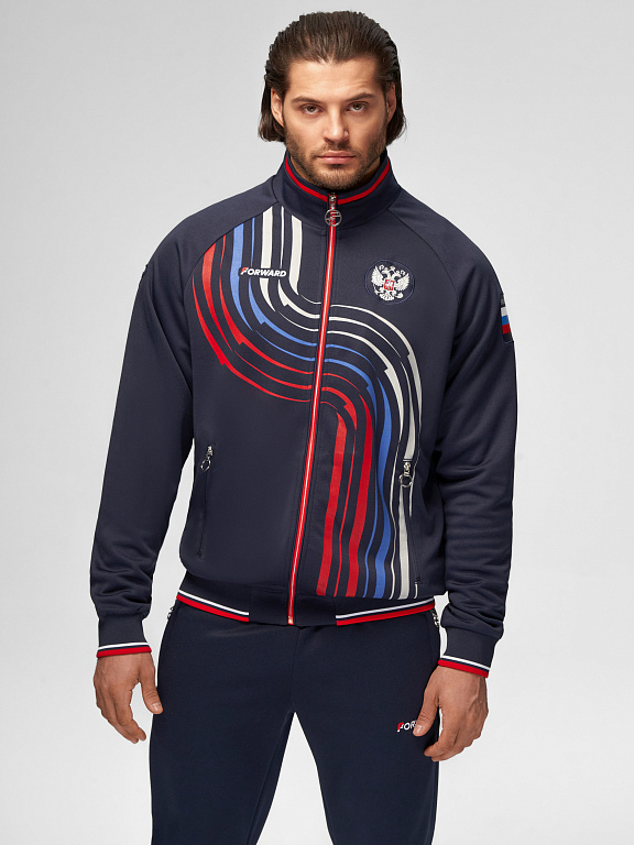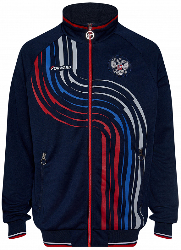 Куртка прямого силуэта на подкладке из сетки. Воротник стойка, внутреняя сторона из трикотажного полотна ластик. Полочка с центральной застежкой молнией. На полочках прорезные боковые карманы на молнии. Рукава покроя Реглан с отрезными манжетами из трикотажного полотна ластик. Низ изделия с поясом из трикотажного полотна ластик. Нанесения на куртке: Жаккардовый шеврон «Герб РФ», жаккардовый шеврон «Флаг РФ», принт «РОССИЯ, Мы Вместе. Спорт», принт «FORWARD», декоративный принт «Трек». Брюки слегка заужены. Боковые карманы в контсруктиных швах на тесьме молнии. Вдоль боковых швов декоративный принт. Пояс с эластичной тесьмой. Ширина пояса регулируется шнуром, вложенным внутрь. В боковых швах, по низу брюк выполнены разрезы с тесьмой молнией. Нанесения брюки: вышивка «FORWARD». Состав: ткань верха 100% полиэстер 250г/м², подкладка сетка: 100% полиэстер.