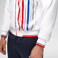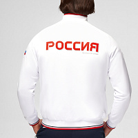 Куртка прямого силуэта на подкладке из сетки. Воротник стойка, внутреняя сторона из трикотажного полотна ластик. Полочка с центральной застежкой молнией. На полочках прорезные боковые карманы на молнии. Рукава покроя Реглан с отрезными манжетами из трикотажного полотна ластик. Низ изделия с поясом из трикотажного полотна ластик. Нанесения на куртке: Жаккардовый шеврон «Герб РФ», жаккардовый шеврон «Флаг РФ», принт «РОССИЯ, Мы Вместе. Спорт», принт «FORWARD», декоративный принт «Трек». Брюки слегка заужены. Боковые карманы в контсруктиных швах на тесьме молнии. Вдоль боковых швов декоративный принт. Пояс с эластичной тесьмой. Ширина пояса регулируется шнуром, вложенным внутрь. В боковых швах, по низу брюк выполнены разрезы с тесьмой молнией. Нанесения брюки: вышивка «FORWARD». Состав: ткань верха 100% полиэстер 250г/м², подкладка сетка: 100% полиэстер.