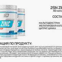 2SN Zinc Citrate – это цинк в сочетании с цитратом (лимонной кислотой). Цинк является наиважнейшим микроэлементов в нашем организме и выполнят большое количество жизненно важных функций. Форма цитрата является одной из самых эффективных, имеет максимальную биодоступность и усвояемость. Цинк обеспечивает выработку специальных ферментов, которые в свою очередь влияют на образование половых гормонов в мужском организме, обеспечивает нормальную работу предстательной железы. Так же цинк положительно влияет на работу иммунной системы, поддерживая работу лейкоцитов. Цинк влияет на выведение углекислого газа из организма, что поддерживает нормальную работу дыхательной и кровеносной системы. Так же цинк обеспечивает нормальный уровень обмена веществ, улучшает усвоение витамина Е. Размер порции: 1 капсула Количество порций: 60 Состав на одну порцию: Цитрат цинка – 25 мг Рекомендации по приему: Принимать одну капсулу 1-2 раза в день после еды.