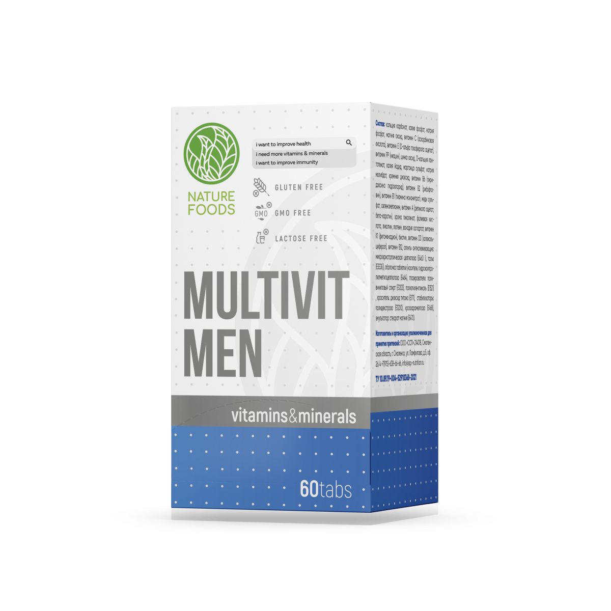 Nature Foods Multi Men – это мужской сбалансированный комплекс витаминов и минералов для ежедневного приема. Имеет невысокие концентрации компонентов, поэтому может быть использован не только спортсменами, но и людьми ведущих малоподвижный образ жизни. Включает весь известный спектр витаминов, витаминоподобных веществ, макроэлементов и микроэлементов. Подходит для мужчин ведущих активный образ жизни и занимающихся спортом или любой другой физической активностью. Обеспечивает быстрое восстановление и укрепляет иммунитет. Полностью покрывает дневной дефицит витаминов и минералов. Оказывает профилактическое действие на мужскую репродуктивную систему. Идеально сочетается с другими добавками спортивного питания. Имеет высокую биологическую доступность всех компонентов. Хорошо переносится, не оказывая дискомфорт для желудочно-кишечного тракта. Размер порции: 1 таблетка Количество порций: 60 Состав на одну порцию: Витамин А – 0,75 мг Витамин С – 60 мг Витамин D3 – 12,5 мкг Витамин Е – 50 мг Витамин К1 – 30 мкг Витамин В1 – 1,5 мг Витамин В2 – 1,7 мг Витамин В6 – 3 мг Витамин В12 – 9 мг Ниацин (витамин РР) – 20 мг Фолиевая кислота – 400 мкг Биотин – 30 мкг Пантотеновая кислота – 10 мг Цинк – 11 мг Кремний – 2 мг Лютеин – 250 мкг Ликопин – 300 мкг Фосфор – 20 мг Кальций – 220 мг Калий – 80 мг Йод – 150 мкг Селен – 19 мкг Медь – 0,5 мг Марганец – 2,3 мг Хром – 50 мкг Молибден – 45 мкг Ванадий – 10 мкг Магний – 50 мг Рекомендации по приему: Принимать одну таблетку в день после завтрака. Можно увеличить дневную дозировку в зависимость от массы тела, рациона питания и задач.