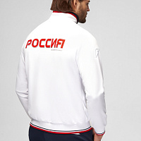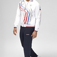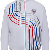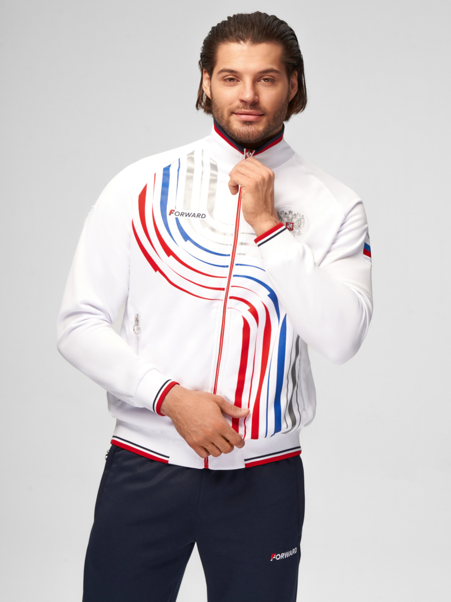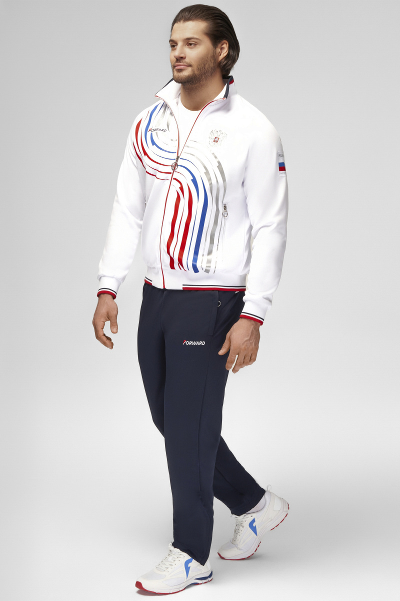 Куртка прямого силуэта на подкладке из сетки. Воротник стойка, внутреняя сторона из трикотажного полотна ластик. Полочка с центральной застежкой молнией. На полочках прорезные боковые карманы на молнии. Рукава покроя Реглан с отрезными манжетами из трикотажного полотна ластик. Низ изделия с поясом из трикотажного полотна ластик. Нанесения на куртке: Жаккардовый шеврон «Герб РФ», жаккардовый шеврон «Флаг РФ», принт «РОССИЯ, Мы Вместе. Спорт», принт «FORWARD», декоративный принт «Трек». Брюки слегка заужены. Боковые карманы в контсруктиных швах на тесьме молнии. Вдоль боковых швов декоративный принт. Пояс с эластичной тесьмой. Ширина пояса регулируется шнуром, вложенным внутрь. В боковых швах, по низу брюк выполнены разрезы с тесьмой молнией. Нанесения брюки: вышивка «FORWARD». Состав: ткань верха 100% полиэстер 250г/м², подкладка сетка: 100% полиэстер.