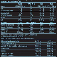 - 26 активных компонентов - 200 мг кофеина на порцию - Экстракты 9 растений - 2 источника левокарнитина: левокармитина L-тартрат и ацетил левокарнитина - Холин, инулин, гидроксилимонная кислота (из экстракта плодов гарцинии камбоджийской) и CLA (конъюгированная линолевая кислота) - L-тирозин - 4 микроэлемента: железо, йод, цинк, хром - 5 витаминов: комплекс витаминов В (B3, B5, B6, B9 и B12) - 30 порций BLACK BURN — ЭКСТРЕМАЛЬНАЯ КОМПОЗИЦИЯ, В КОТОРУЮ МЫ ВЛОЖИЛИ ВСЁ! 1. Сделай всё необходимое, чтобы оптимизировать жировой обмен веществ. Среди действующих веществ порошка Black Burn цинк способствует нормальному обмену жирных кислот. Холин участвует в нормальном жировом обмене веществ. 2. Наполняйся энергией! Среди содержащихся в порошке витаминов ниацин, пантотеновая кислота, а также витамин В6 и В12 участвуют в нормальном жировом обмене веществ и способствуют снижению степени усталости и утомляемости. 3. Стимуляция на всех уровнях! Железо, йод и цинк, содержащиеся в порошке Black Burn способствуют поддержанию умственной активности. Йод также способствует нормальному функционированию нервной системы. Содержащаяся в порошке фолиевая кислота (витамин В9) способствует поддержанию нормальных психологических функций. 4. Оптимизируй аппетит! Содержащийся в порошке хром способствует поддержанию нормального уровня сахара в крови. Ничего лишнего, только вымеренная до граммов суть! Кроме комплекса витаминов и минеральных веществ, служащих основой порошка Black Burn, в нём содержатся также такие популярные компоненты, как левокарнитин, L-тирозин, конъюгированная линолевая кислота, гидроксилимонная кислота или инозитол. Среди разнообразных действующих веществ порошка есть также экстракты 9-и растений, например Coleus forskohlii, зелёного чайного листа, зелёного кофе и гуараны. Экстракты последних трёх растений также являются источником натурального кофеина, но кроме этого мы добавили в порошок ещё и дегитратизированный кофеин, чтобы дать тебе ещё больше энергии для тренировок! Одно из преимуществ ароматизированного порошка для приготовления напитка Black Burn заключается в том, что в него входят также пищевые волокна инулина. Рекомендации по применению: принимать 1 порцию (7 г = 2 дозировочные ложечки без горки = 2 чайные ложки), разведённую в шейкере 300 мл воды, в промежутке между приёмами пищи. Не применять перед сном. Нельзя превышать рекомендуемую дозу!
