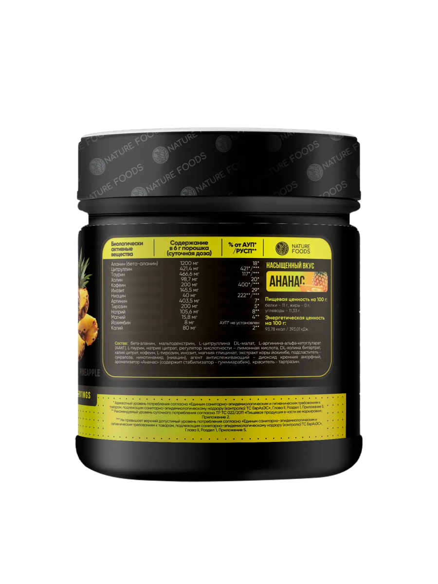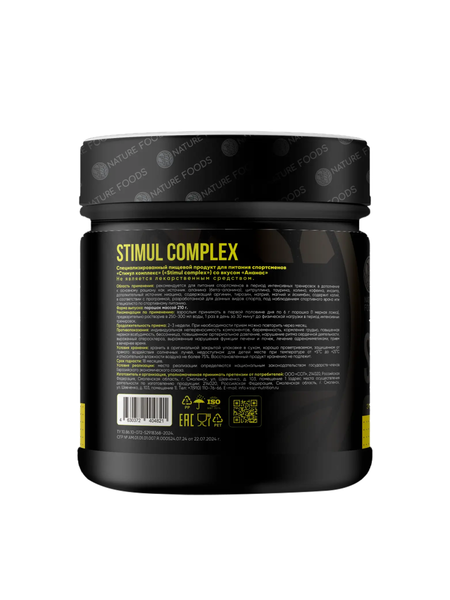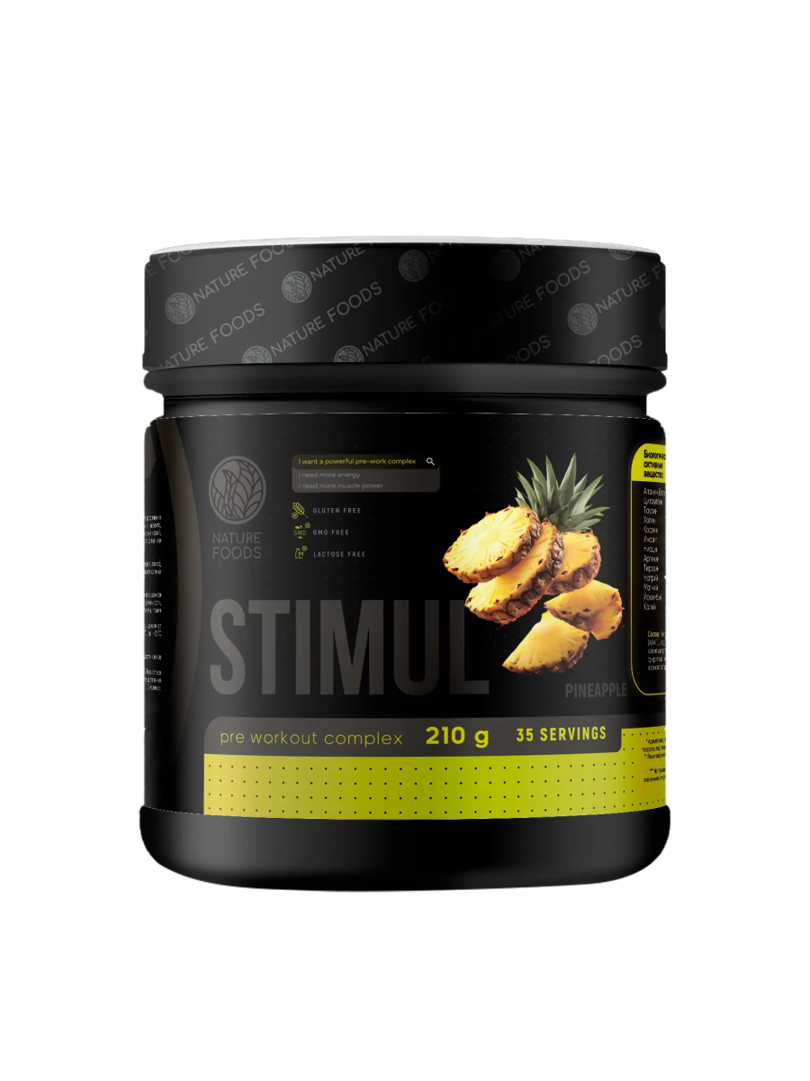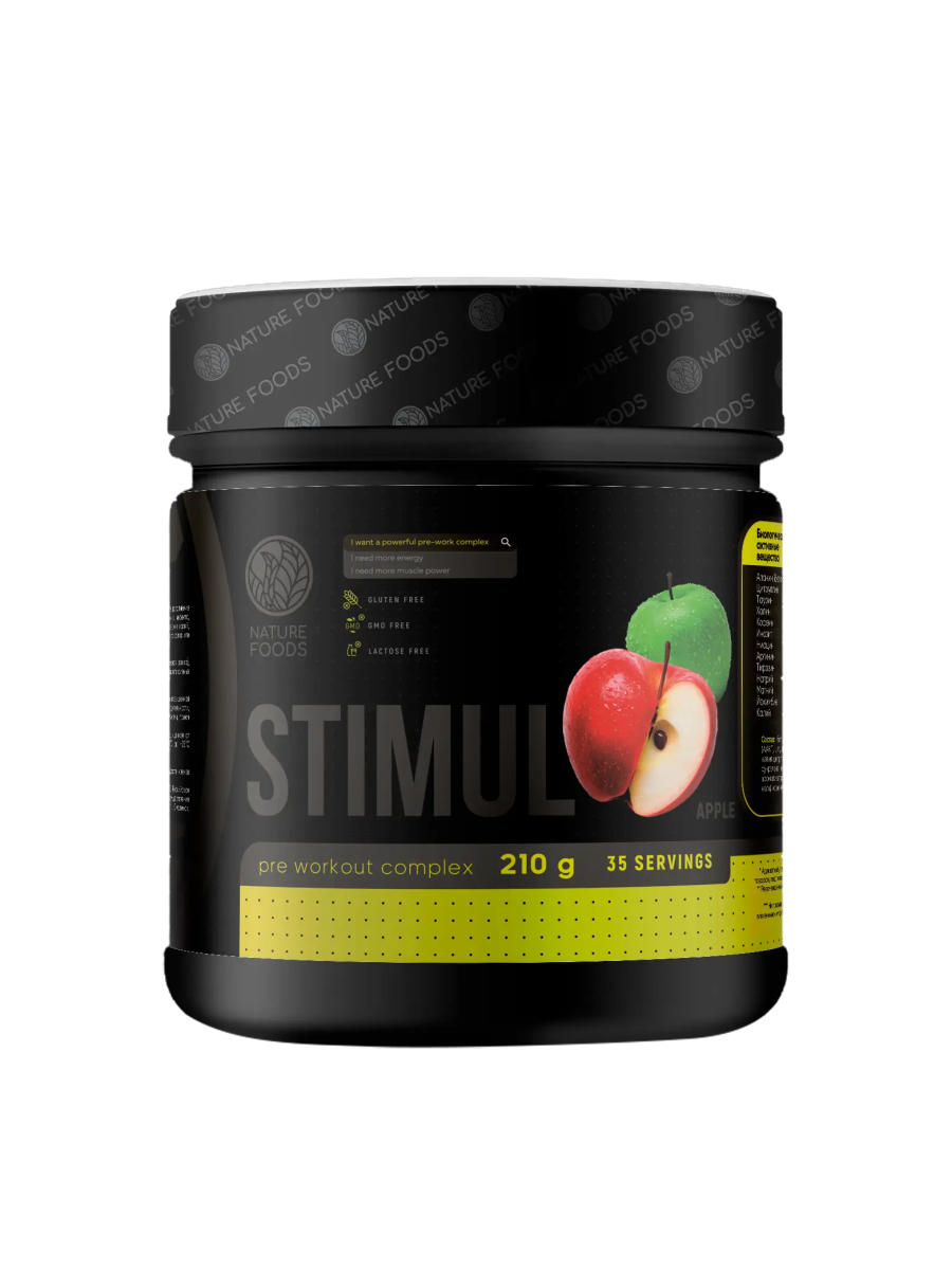 Nature Foods Stimul Complex 210 g – это современный предтренировочный комплекс, разработанный для повышения энергии, концентрации и выносливости во время тренировок. Сочетание активных компонентов стимулирует нервную систему, улучшает приток крови к мышцам и помогает достичь максимальной продуктивности. Преимущества Nature Foods Stimul Complex: мощный заряд энергии и концентрации; повышение физической выносливости и силы; улучшение кровообращения и пампа мышц; ускорение восстановления после нагрузок; поддержка мотивации и интенсивности тренировок. Кому подойдет Stimul Complex: спортсменам силовых видов спорта; любителям фитнеса и активного образа жизни; тем, кто хочет увеличить интенсивность и эффективность тренировок; при усталости и сниженной мотивации перед занятием. Рекомендации по применению: Размешать 1 порцию (5–10 г) с 200 мл воды и принимать за 20–30 минут до тренировки. Nature Foods Stimul Complex 210 g – это оптимальная поддержка энергии, концентрации и силы для результативных тренировок.