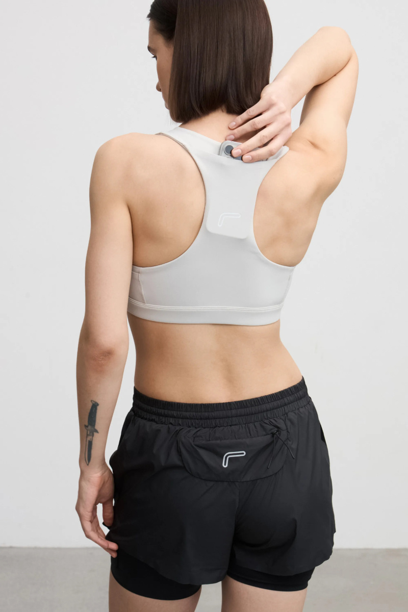 Бра для бега. Модель со средней степенью поддержки из мягкой эластичной ткани в анатомическом крое. Эффективно выводит лишнюю влагу и сохраняет свободу движений. Три кармана — два по бокам и один сзади — позволяют взять на пробежку спортивное питание и телефон.