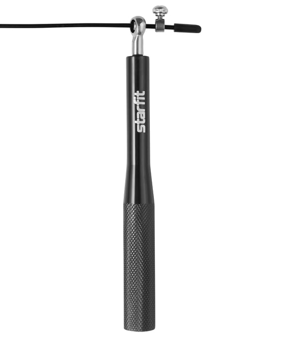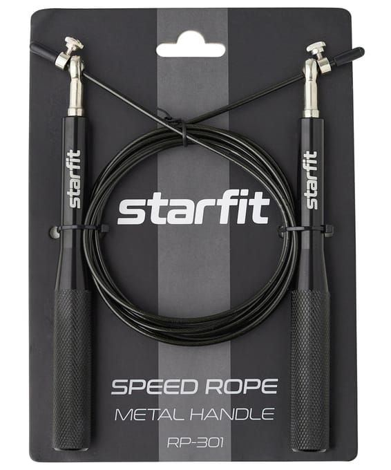 Скакалка скоростная RP-301 бренда STARFIT – многофункциональный спортивный инвентарь для фитнеса дома или на улице. Эти прыгалки взрослые с металлическими ручками позволяют совершать двойные и тройные прыжки, такая скакалка для фитнеса взрослая отлично подойдет для кардиотренировок и функционального тренинга. Также модель прекрасно зарекомендовала себя как скакалка для кроссфита, и как скакалка для бокса. Скоростная скакалка имеет металлические 3D-шарниры, которые улучшают показатели изделия благодаря отсутствию ограничения вращения троса вокруг оси и продлевают срок эксплуатации. Скакалки дополнены ручками из металла с глубокой насечкой, это гарантирует надежный хват. Встроенные подшипники позволяют увеличить темп прыжков и повышают плавность хода троса, а для безопасности тренировок стальной трос покрыт защитным слоем. Длина регулируется с помощью специального ограничителя. Преимущества: Очень быстрая благодаря подшипникам и 3D шарнирам; Предусмотрены ограничители длины для быстрого изменения длины скакалки; Утяжеленные ручки для более экспертных пользователей. Характеристики: Материал шнура: металл, поливинилхлорид Длина шнура, см: 300 Диаметр шнура, см: 0,3 Материал ручки: металл Длина ручки, см: 18 Диаметр ручки в месте хвата, см: 1,8 Цвет: черный Вес без упаковки, кг: 0,22 Тип упаковки: карточка с подвесом, пакет Количество в упаковке, шт: 1 Производство: КНР
