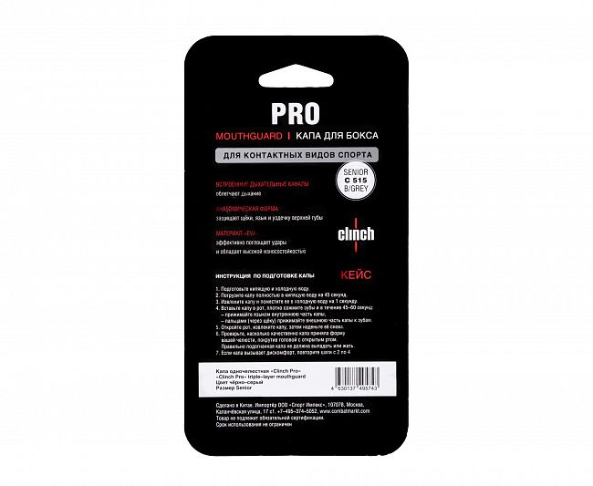 Трехслойная капа PRO снижает и распределяет нагрузку при сильном ударе, предотвращает повреждения зубов и защищает слизистую спортсмена от рассечений. Одна из последних разработок бренда, CLINCH PRO имеет три слоя и изготовлена по технологии Highprotect, что предполагает сверхвысокую степень защиты спортсмена. Капа изготовлена из термоформируемого материала EVA, который используют в производстве кап бренды мирового уровня. EVA — полимер, который имеет самые высокие показатели прочности и износостойкости, а также абсолютно не токсичен и безопасен. Гибкий и эластичный, этот материал прекрасно амортизирует и принимает ударную нагрузку на себя. CLINCH PRO обеспечивает максимальное поглощение удара, снимая до 40% ударной нагрузки с мозга, благодаря трем слоям. Первый слой, жесткий и плотный, держит конструкцию. Второй, внутренний — более мягкий и гибкий, он поддается термовоздействию и принимает форму зубов для идеальной посадки капы. По своей структуре этот слой напоминает гелевый материал, который великолепно амортизирует удары. Третий — усиливает участки в зоне жевательных зубов, что увеличивает срок службы капы. Инструкция по термической обработке расположена на упаковке капы. После варки допускается подрезание заднего края по длине зубного ряда, чтобы свести к нулю риск рвотного рефлекса. В комплекте идет защитный кейс для хранения капы. Помимо бокса, капа подходит для активных видов спорта, где предполагается использовать защитный шлем (хоккей, американский футбол и т.д.) Поэтому CLINCH PRO снабжена тонким ремешком для фиксации капы к шлему также тонкий ремешок для фиксации капы к шлему. Этот же ремешок можно использовать как держатель во время термообработки. технология Highprotect обеспечивает максимальное распределение ударной нагрузки изготовлена из высокотехнологичного термоформируемого материала EVA Три слоя для идеальной амортизации + усиленные участки в зоне жевательных зубов В комплекте кейс для хранения и ремешок-держатель для варки капы