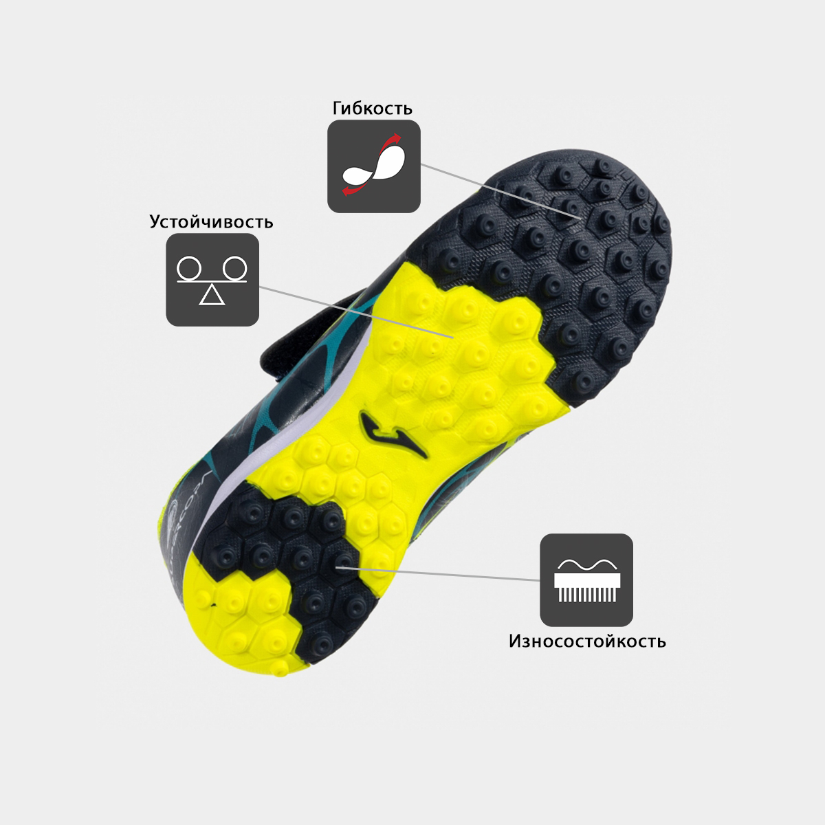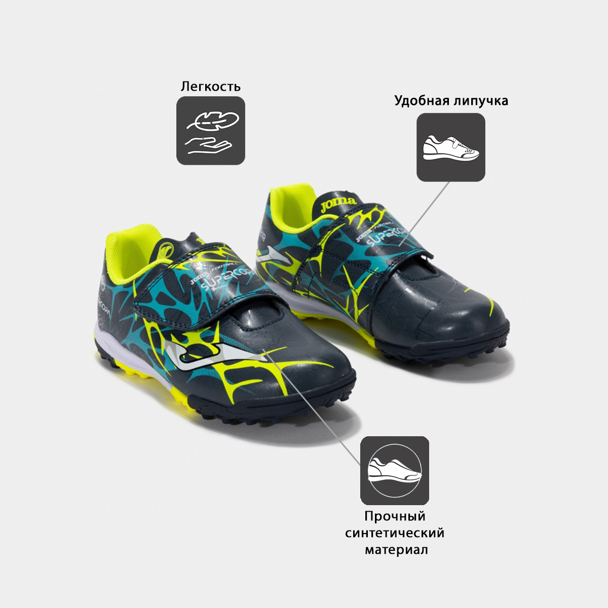 Детские бутсы для игры на искусственном газоне, обеспечивающие хороший контроль мяча. Легкие и прочные. Верх выполнен из синтетического материала с минимальным количеством швов. Это снижает вес и улучшает посадку стопы. Внутри использован текстильный материал. Подошва изготовлена из износостойкой резины с применением технологии DURABILITY. Линии FLEXO на подошве делают ее более гибкой и способствуют естественности движений стопы во время бега. Вместо шнурков использована липучка, с помощью которой ребенок может самостоятельно надеть обувь перед игрой или тренировкой.