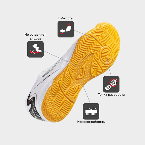 JOMA MAXIMA – надежные и комфортные футзалки. Верх изготовлен из высококачественного синтетического материала Fibratec, напоминающего кожу, с перфорацией для доступа воздуха. Носок усилен для износостойкости, а также для увеличения силы и точности ударов. В области голеностопа использован мягкий, дышащий нейлон, обеспечивающий комфорт и оптимальную посадку стопы. Подошва MAXIMA изготовлена из высококачественной, износостойкой резины (DIN-70) с применением технологии DURABILITY, которая обеспечивает хорошее сцепление с игровой поверхностью. Рисунок на подошве (система ROTATION) помогает игроку легко и быстро совершать резкие развороты на ограниченном пространстве. А линии Flexo обеспечивают гибкость и естественное движение стопы во время бега.