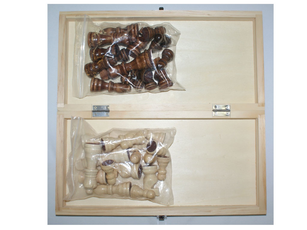 Фигуры бежевого и коричневого цвета, выполнены из дерева, основание покрыто коричневым бархатом. Доска складная выполнена из дерева (не лакированая), по периметру игрового поля нанесена шахматная нотация. Внутри доски место для хранения фигур, снаружи железная защелка, предотвращающая случайное открытие доски.