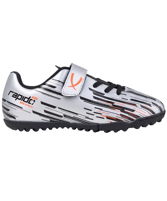 Обновленные цвета хорошо всем известной модели Rapido Kids из линейки neo.Sprint. Многошиповые бутсы отлично подходят для игры на искусственных и неровных поверхностях. Они стали еще практичнее, комфортнее и технологичнее. В Rapido Kids используется технология Speedtech для максимальной скорости на поле. Анатомическая форма новой колодки обеспечивает еще более правильное положение стопы. Носочная часть усилена дополнительной прошивкой. Мягкая стелька из материала ЭВА распределяет нагрузку и дает необходимый комфорт. Улучшенный механизм липучки и не требующие завязывания резиновые шнурки - теперь надевание будет еще быстрее и удобнее. Для дополнительного вентилирования в язычке сделаны специальные отверстия. Подошва обуви оснащена резиновыми шипами, которые обеспечивают оптимальное сцепление с искусственными покрытиями. В производстве обуви Jögel используются только качественные материалы, обувь легко моется и не требует дополнительного ухода. Технология Speedtech - соединение облегченных материалов и динамичной конструкции бутсы, позволяющее футболисту раскрыть свои скоростные способности. Преимущества: Резиновые шипы для оптимального сцепления с искусственными покрытиями; Технология Speedtech для максимальной скорости на поле; Анатомическая колодка; Резиновые шнурки не требуют завязывания; Мягкая стелька из ЭВА. Характеристики: Материал верха: полиуретан Материал подкладки обуви: текстиль Материал подошвы обуви: резина Материал стельки: этиленвинилацетат, текстиль Полнота обуви: Е Размерный ряд: 28-33 (RU) Основной цвет: серебристый Дополнительные цвета: черный/оранжевый Вид застежки: шнурки Тип подошвы: шипованная Назначение обуви: спорт, футбол Рекомендованные покрытия: искусственный газон, тюрф, гравийные покрытия Комплектация: бутсы, коробка Вес пары, г: 400 г Тип упаковки: коробка со стикером Страна производства: Китай