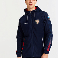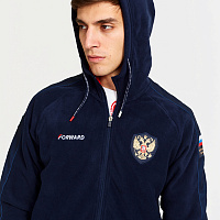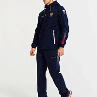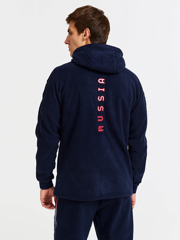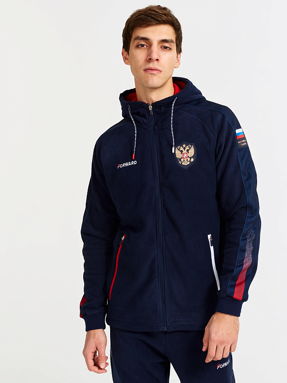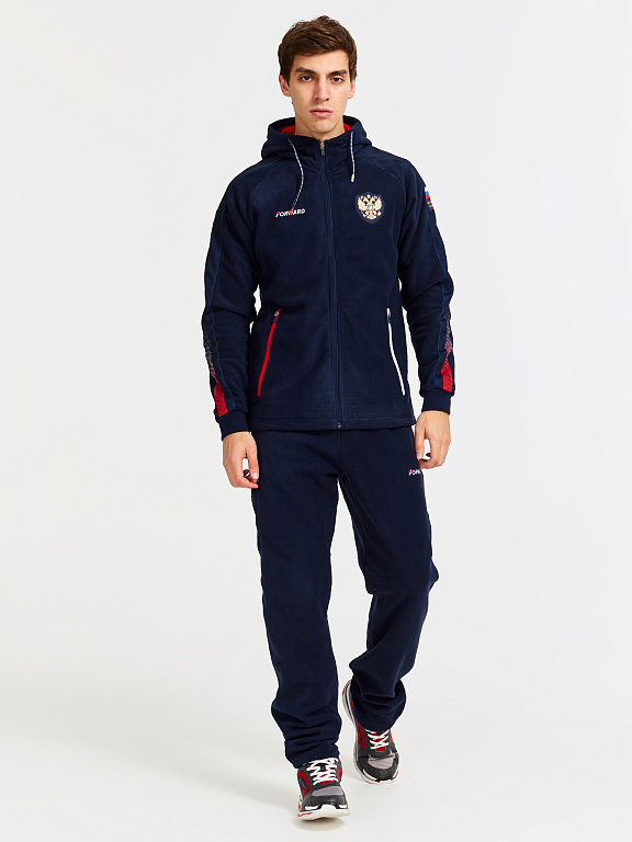 Мужской флисовый костюм неприхотлив в уходе. Костюм выполнен из гипоаллергенного полотна с высокими гигроскопическими свойствами, быстро сохнет и не мнется. Куртка прямого силуэта с капюшоном. Полочка с центральной застежкой на тесьму-молнию. Боковые карманы прорезные обработаны с тесьмой-молнией. Капюшон регулируется по высоте с помощью шнурка. Рукава комбинированного покроя. Вставки рукавов выполнены из ткани-компаньона. Манжеты выполнены из трикотажного полотна ластик. Низ изделия регулируется при помощи эластичного шнура и фиксаторов. Нанесения на куртке: жаккардовый шеврон «Герб РФ+NATIONAL TEAM», жаккардовый шеврон «Флаг РФ», вышивка «FORWARD», аппликативная вышивка «RUSSIA», фирменный принт. Брюки слегка зауженного к низу силуэта, с боковыми вставками из полотна-компаньона. Боковые карманы застегиваются на молнию. Пояс с эластичной тесьмой. Ширина пояса регулируется шнуром, вставленным внутрь. Ширина по низу регулируется при помощи эластичного шнура и фиксаторов. Нанесения на брюках: вышивка «FORWARD», фирменный принт. Куртка прямого силуэта с капюшоном. Полочка с центральной застежкой на тесьму молнию. Боковые карманы прорезные обработаны с тесьмой молнией. Капюшон регулируется по высоте с помощью шнурка. Рукава покроя реглан. Вставки рукавов, выполнены из ткани компаньона. Манжеты выполнены из трикотажного полотна ластик. Низ изделия регулируется при помощи эластичного шнура и фиксаторов. Нанесения на куртке: Жаккардовый шеврон «Герб РФ», жаккардовый шеврон «Флаг РФ+NATIONAL TEAM», вышивка «FORWARD», аппликативная вышивка «RUSSIA», 3D вышивка «F», фирменный принт. Брюки слегка зауженного к низу силуэта, с боковыми вставками из полотна компаньона. Боковые карманы, застегиваются на молнию. Пояс с эластичной тесьмой. Ширина пояса регулируется шнуром, вставленным внутрь. Ширина по низу регулируется при помощи эластичного шнура и фиксаторов. Нанесения на брюках: вышивка «FORWARD», фирменный принт. Состав: ткань верха 100% полиэстер 240г/м², флис с двусторонним подчесом, 100% полиэстер 240г/м², флис с ламинацией.