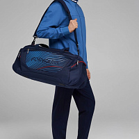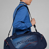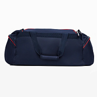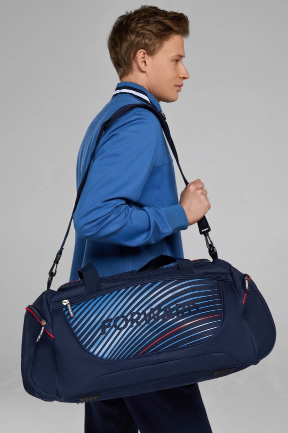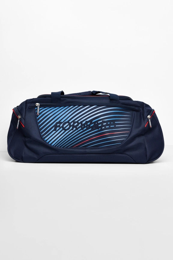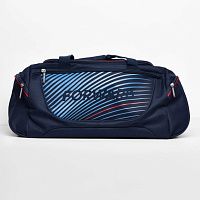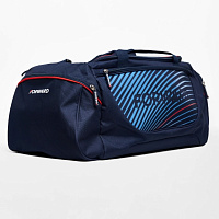 Сумка спортивная с жестким дном. Центральное отделение застёгивается крышкой на 2х замковую тесьму молнию. На внутренней стороне крышки располагается карман из галантерейной сетки. На передней боковой стенке обработан карман с застежкой на тесьму молнию. На торцевых стенках, расположены карманы, которые застёгиваются на тесьмы молнии. Для удобства эксплуатации сумки на ручку настрочена накладка с контактной лентой. Плечевой ремень пристёгивается с помощью карабинов. Для регулировки длинны ремня предусмотрена пряжка. Объем сумки литров. В*Ш*Г . Нанесения: принт «FORWARD», принт сублимация Состав: 100% полиэстер, 420 г/м² подкладка 100% полиэстер.