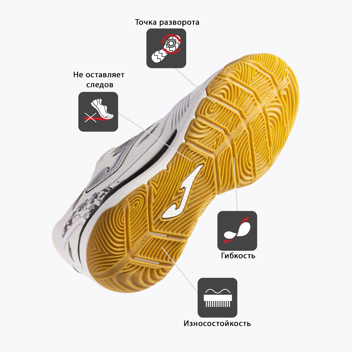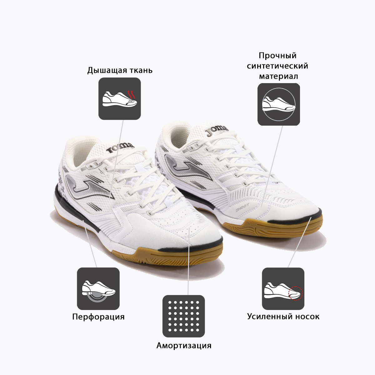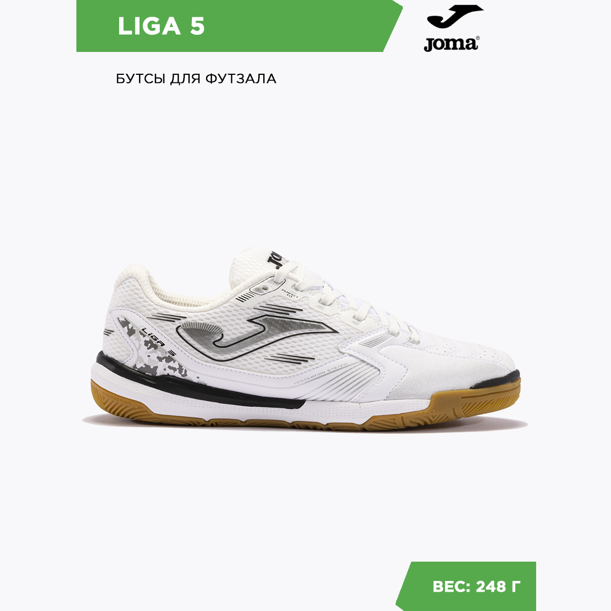 Футзалки Joma Liga 5 – это сочетание легкости, долговечности и комфорта. Верх изготовлен из дышащего сетчатого текстиля и укреплен вставками из термополиуретана (TPU) по технологии SPORTECH. В носочной области использован мягкий и очень прочный, напоминающий кожу синтетический материал Fibertec, который позволят игроку максимально эффективно контролироваться мяч. Для усиления эффекта вентиляции в этих футзалках применена технология VTS. Пятка усилена и надежно защищает игрока от травм. Благодаря симметричной шнуровке достигается оптимальная и комфортная фиксация стопы. Носок прошит и усилен с помощью специального материала по системе PROTECTION для защиты и повышения силы и точности удара. Межподошва Liga 5 выполнена из филона, который обеспечивает хороший уровень амортизации. Подошва изготовлена по технологии DURABILITY из износостойкой резины, обеспечивающей отличный контакт с игровой поверхностью. Эргономично расположенные линии на протекторе (технология FLEXO) обеспечат гибкость и естественный переход от пятки к носку во время движения.