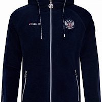 Куртка прямого силуэта с капюшоном. Полочка с центральной застежкой на тесьму молнию. Боковые карманы прорезные обработаны с тесьмой молнией. Капюшон регулируется по высоте с помощью шнурка. Рукава покроя реглан.На рукавах декоративные вставки из ламинированного флиса. Манжеты выполнены из трикотажного полотна ластик. Низ изделия регулируется при помощи эластичного шнура и фиксаторов. Нанесения на куртке: Жаккардовый шеврон «Герб РФ», жаккардовый шеврон«Флаг РФ», вышивка «FORWARD», принт «Мы вместе . Спорт». Брюки слегка зауженного к низу силуэта. Боковые карманы прорезные, застегиваются на молнию. Вдоль боковых швов декоративныевставки из ламинированного флиса. Пояс с эластичной тесьмой. Ширина пояса регулируется шнуром, вставленным внутрь. Ширина по низу регулируется при помощи эластичного шнура и фиксаторов. Нанесения на брюках: вышивка «FORWARD». Состав: ткань верха 100% полиэстер 240г/м², флис с двусторонним подчесом.