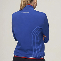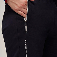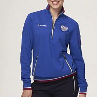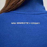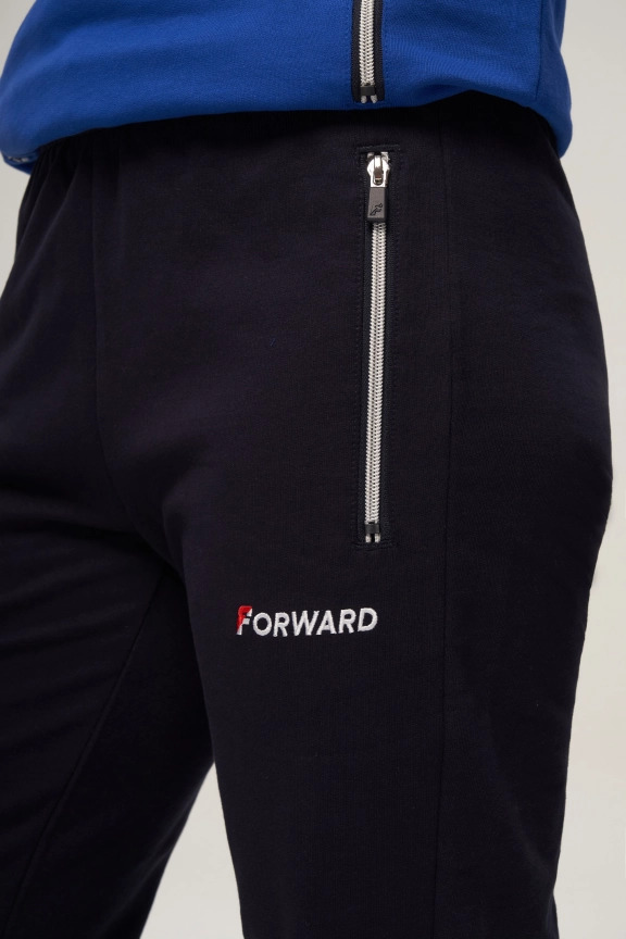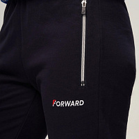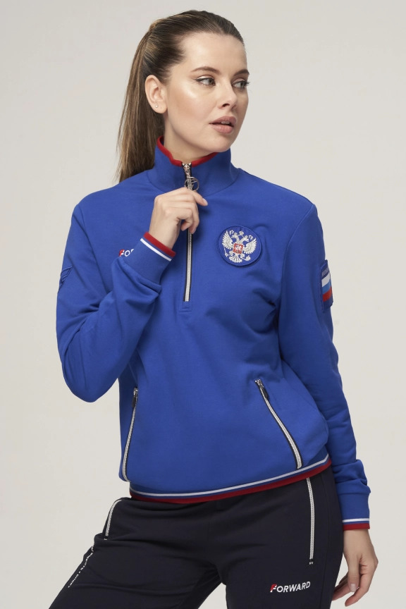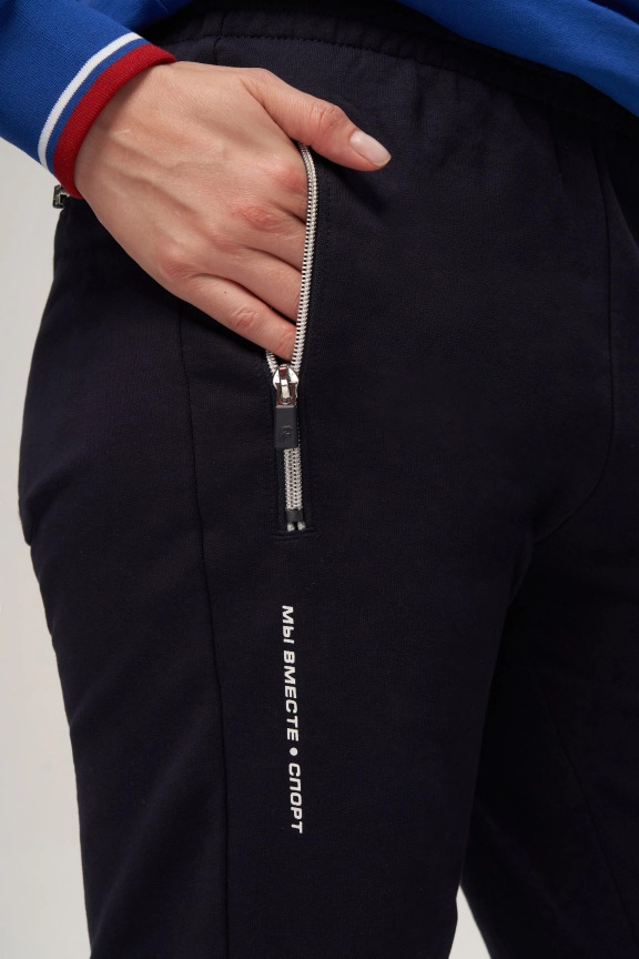 Куртка прямого силуэта. Полочка с центральной застежкой на тесьму молнию до уровня груди, с воротником стойка. Боковые крманы прорезные с входами на тесьме молнии. Рукава втачные. Воротник манжеты рукавов и низ изделия обработаны с трикотажным полотном ластик. Нанесения на куртке: Жаккардовый шеврон «Герб РФ», жаккардовый шеврон «Флаг РФ», вышивка «FORWARD», декоративный принт «Трек», принт «Мы вместе.Спорт». Брюки зауженного силуэта с боковыми, прорезными карманами на тесьму молнию. Пояс с эластичной тесьмой. Ширина пояса регулируется шнуром, вставленным внутрь. Низ брюк выполнен с манжетами из трикотажного полотна ластик. Нанесения брюки: вышивка «FORWARD», вышивка «Мы вместе.Спорт». Состав: 80% хлопок, 20% полиэстер, 290г/м².