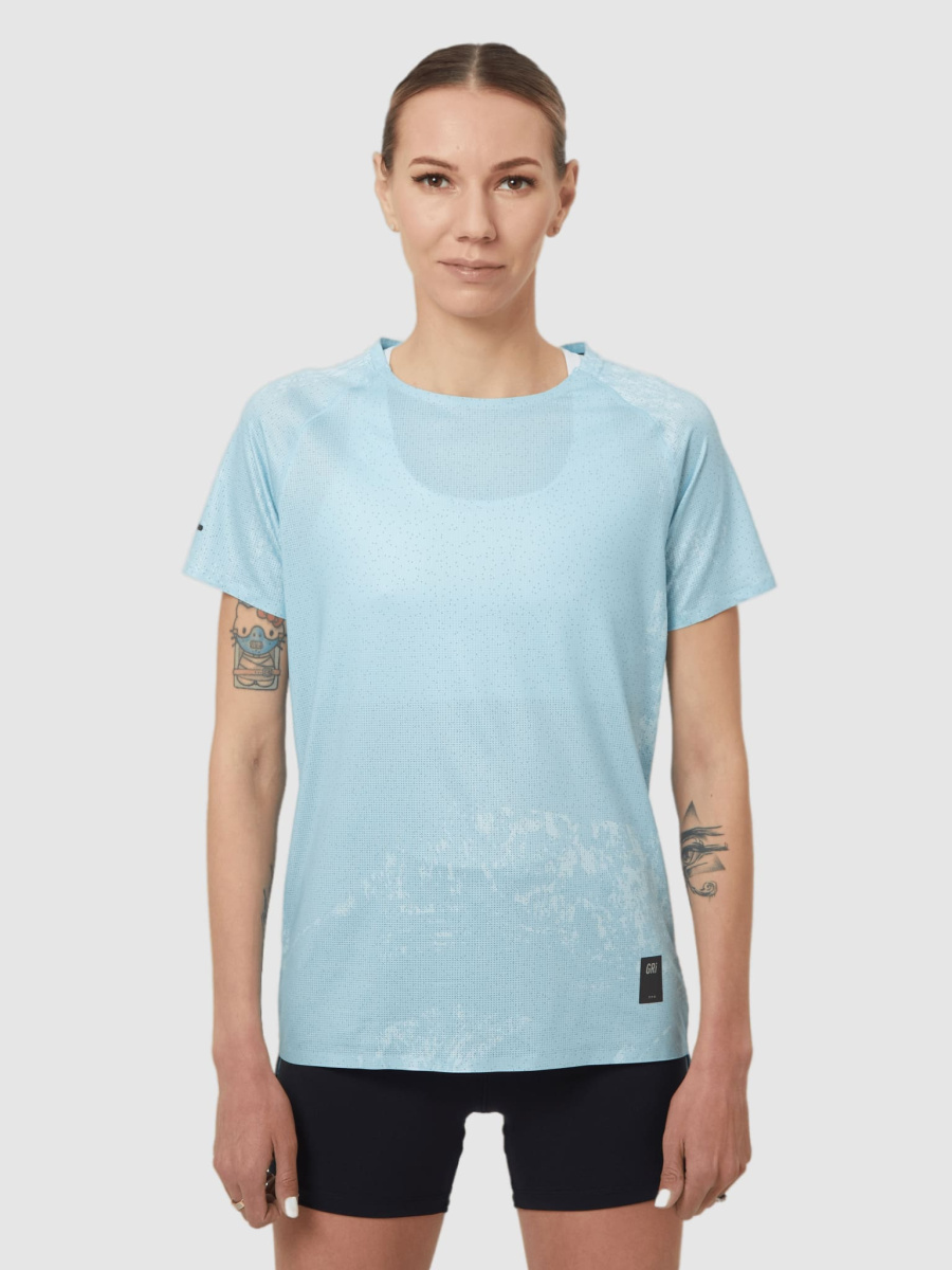 Женская футболка из серии Про. Для соревнований и скоростных тренировок в тёплую погоду весной, летом и осенью. От футболок базовой линейки эта модель отличается клееными швами, принтом и обширной светоотражайкой. Минимум деталей в серии Про, которая создана для быстрого бега! Григорий Лазарев, основатель бренда GRI: «В этой футболке мы используем клееные швы. А ещё — цифровую печать: большой красивый паттерн совмещается со светоотражающими элементами большой площади. Получилось очень красиво». 85% полиэстер, 15% спандекс.