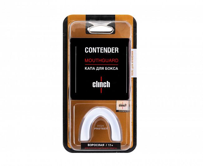 Согласно исследованиями, профессионально выполненная капа способна снять до 40% ударной нагрузки с мозга спортсмена. CLINCH CONTENDER имеет маркировку Highprotect как капа с наивысшей степенью защиты. Ее анатомически выверенная форма приводит в действие нейромышечную активность, благодаря которой не только оптимально распределяется сила удара, но и не перенапрягаются мышцы спины, шеи и плеч спортсмена. CLINCH CONTENDER изготовлена из термоформируемого материала EVA, который используют в производстве кап бренды мирового уровня. Это полимер, который имеет самые высокие показатели прочности и износостойкости, а также абсолютно не токсичен и безопасен. Капа состоит из трех слоев. Внешний, жесткий и плотный, позволяет удерживать форму; мягкий наполнитель выполняет функцию амортизирующей «подушки»; третьим слоем идут дополнительно усиленные задние части в области жевательных зубов. Инструкция по термической обработке расположена на упаковке капы. После варки допускается подрезание заднего края по длине зубного ряда, чтобы свести к нулю риск рвотного рефлекса. Особенностью CLINCH CONTENDER стало наличие дополнительного переднего отверстия для улучшения ротового дыхания, что является приоритетом для многих спортсменов. В комплекте идет защитный кейс для хранения капы. технология Highprotect обеспечивает максимальное распределение ударной нагрузки изготовлена из высокотехнологичного термоформируемого материала EVA Три слоя для идеальной амортизации + наличие дополнительного переднего отверстия для улучшения ротового дыхания В комплекте кейс для хранения