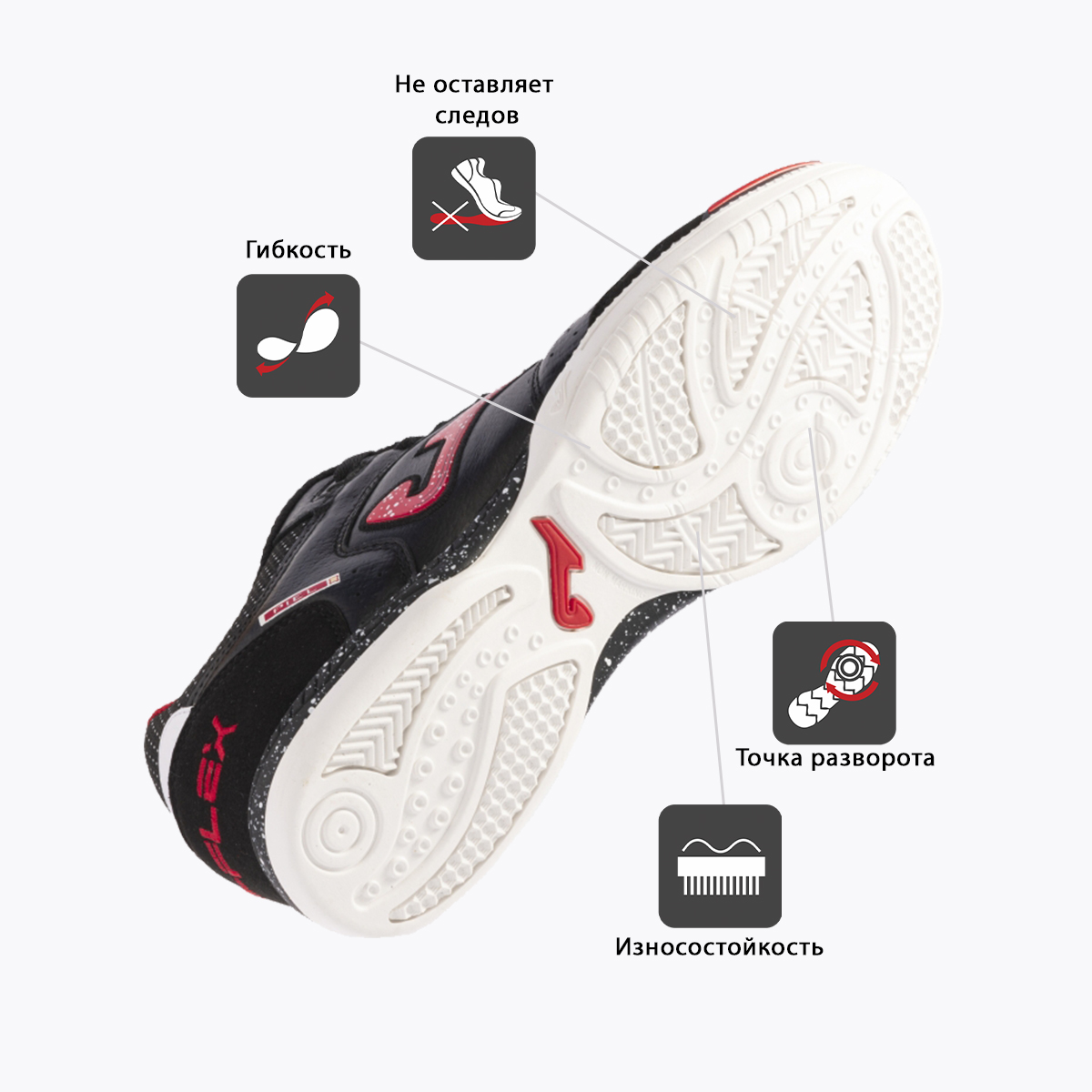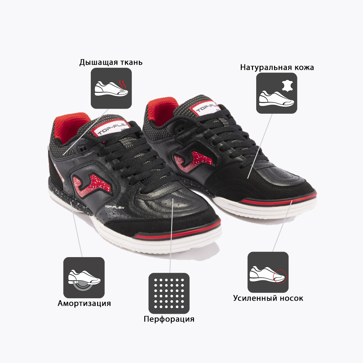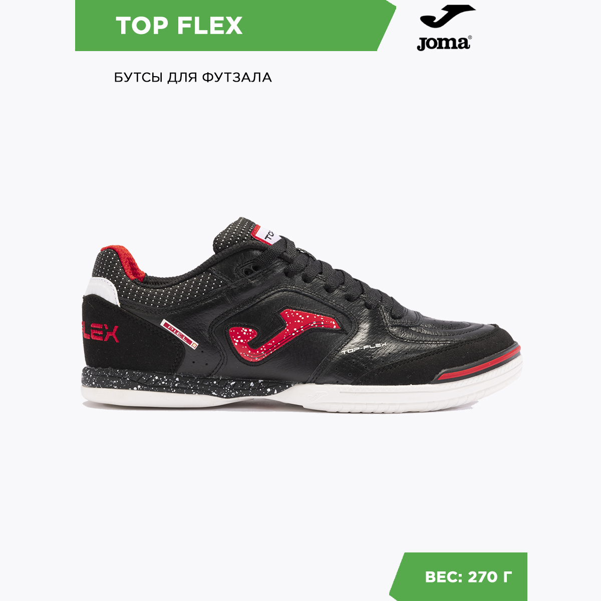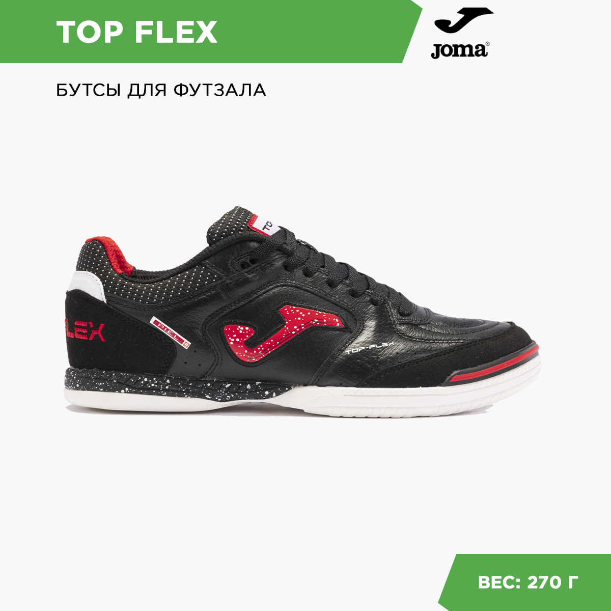 Joma Top Flex – бестселлер испанского бренда. Одни из самых продаваемых футзалок, Top Flex завоевали признание профессионалов благодаря высочайшему качеству материалов, из которых изготовлены. Материалов, определяющих игровые характеристики этой модели: эластичность, контроль мяча, амортизация и долговечность... Joma Top Flex гибкие за счет того, что верхняя их часть изготовлена из натуральной кожи. Идеальная посадка стопы и устойчивость достигается за счет применения системы 360º. Носок и пятка усилены для защиты. За амортизацию отвечает межподошва, выполненная из филона. Для подошвы Joma используют износостойкую резину, обеспечивающую отличный контакт с поверхностью. Интегрированные в рисунок подошвы линии FLEXO добавляют гибкости этим футзалкам.