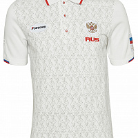 Рубашка Поло выполнена из трикотажного полотна пике, прямого силуэта. Полочка с застежкой планкой на три пуговицы. Рукава втачные с вставками из полотна ластик с частичными манжетами из трикотажного полотна ластик. В боковых швах по низу выполнены разрезы со вставками из принтовоного полотна. Воротник выполнен из трикотажного полотна ластик. С изнаночной стороны спинки обтачка, настроченная на спинку. Нанесения: Жаккардовый шеврон «Герб РФ», жаккардовый шеврон «Флаг РФ, NATIONAL TEAM», принт «RUS», вышивка «FORWARD», 3D вышивка «F», декоративный принт. Состав: 100% хлопок, 200г/м2.