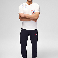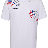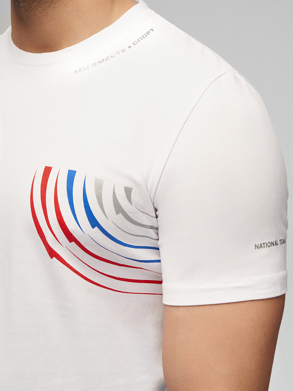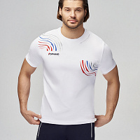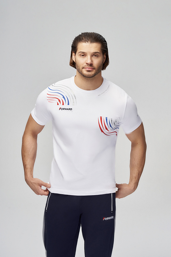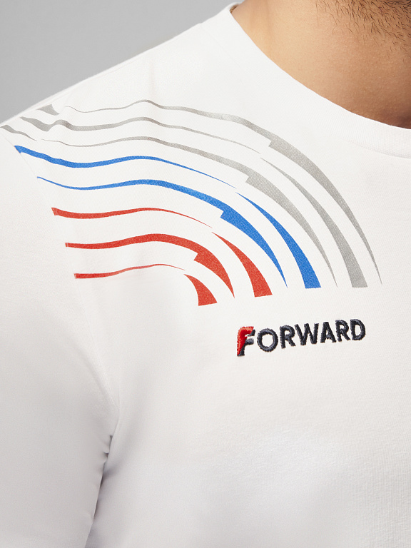 Футболка прямого силуэта с О-образным вырезом горловины. Обтачка горловины выполнена из трикотажного полотна ластик. Рукав втачной. Нанесения: Вышивка «FORWARD», 3D вышивка «F», принт «Трек», принт «NATIONAL TEAM» принт «Мы вместе.Спорт». Состав: 95%хлопок, 5%эластан, 180г/м2.