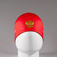 Это спортивная шапка для лыжных тренировок, бега в прохладную погоду, биатлона и других зимних видов спорта. Ориентирована на профессиональных спортсменов и температурный режим от +7°С до -10°С с учётом того, что в ней в это время активно двигаются. Производится из современного прочного, эластичного синтетического материала с отличными дышащими свойствами и способностью отведения влаги. Он защищает от ветра и отводит влагу на внешний слой. Шапка плотно облегает голову, лёгкая и комфортная в носке. Имеет плоские растяжимые, практически не заметные швы, что создаёт комфорт и удобство в носке. Дизайн наносится методом сублимационной печати. Впереди на шапке герб России. По бокам фирменные светоотражающие логотипы.