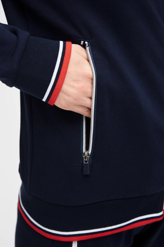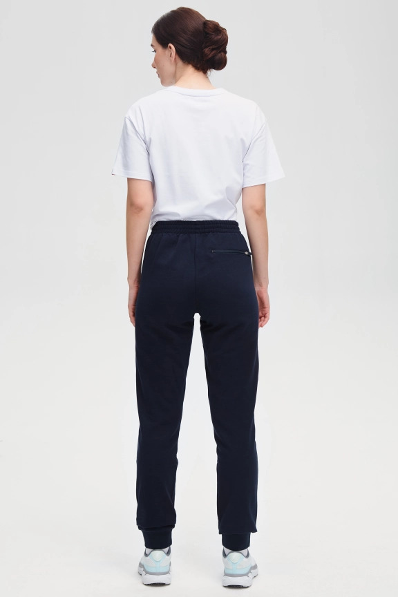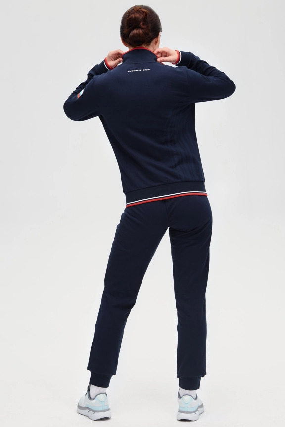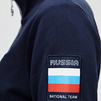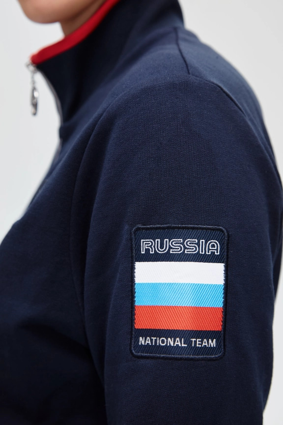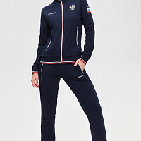 Куртка прямого силуэта. Полочка с центральной застежкой на тесьму молнию, с воротником стойка. Боковые крманы прорезные с входами на тесьме молнии. Рукава втачные. Воротник манжеты рукавов и низ изделия обработаны с трикотажным полотном ластик. Нанесения на куртке: Жаккардовый шеврон «Герб РФ», жаккардовый шеврон «Флаг РФ», вышивка «FORWARD», декоративный принт «Трек», принт «Мы вместе.Спорт». Брюки зауженного силуэта с боковыми, прорезными карманами на тесьму молнию. Пояс с эластичной тесьмой. Ширина пояса регулируется шнуром, вставленным внутрь. Низ брюк выполнен с манжетами из трикотажного полотна ластик. Нанесения брюки: вышивка «FORWARD», вышивка «Мы вместе.Спорт». Состав: 80% хлопок, 20% полиэстер