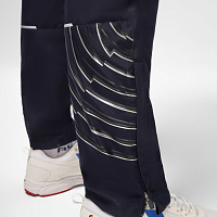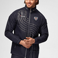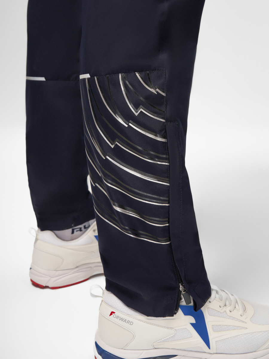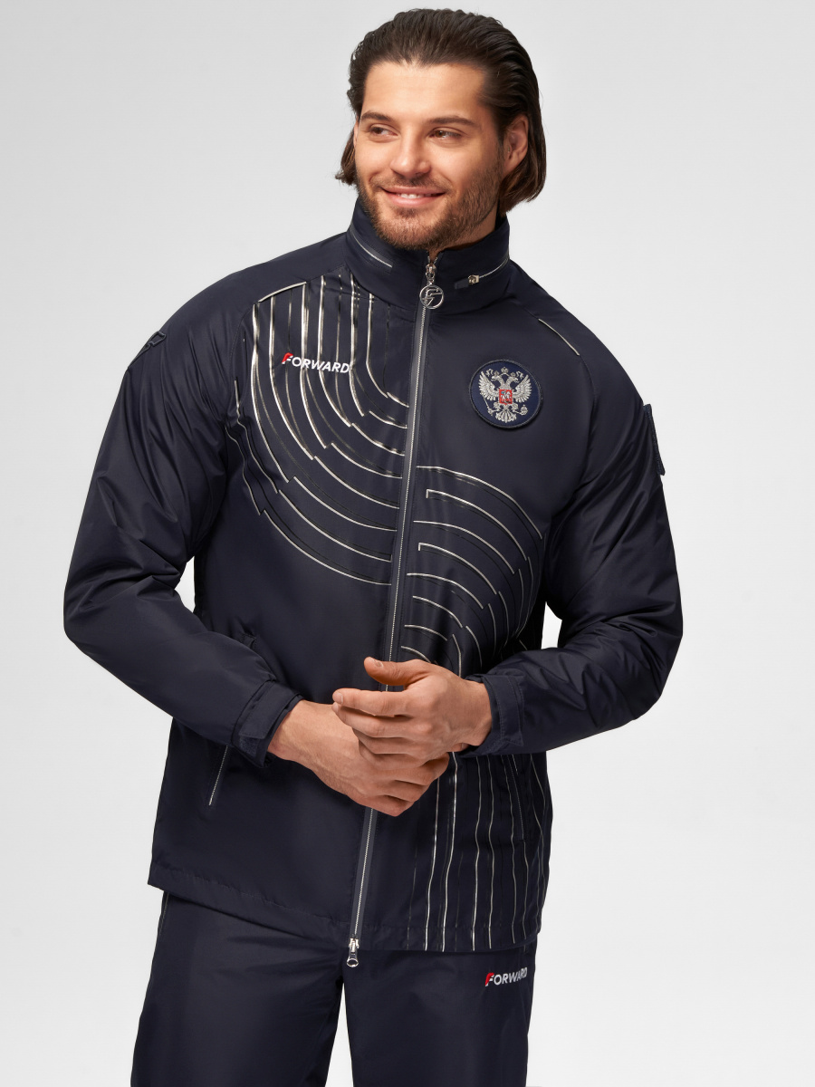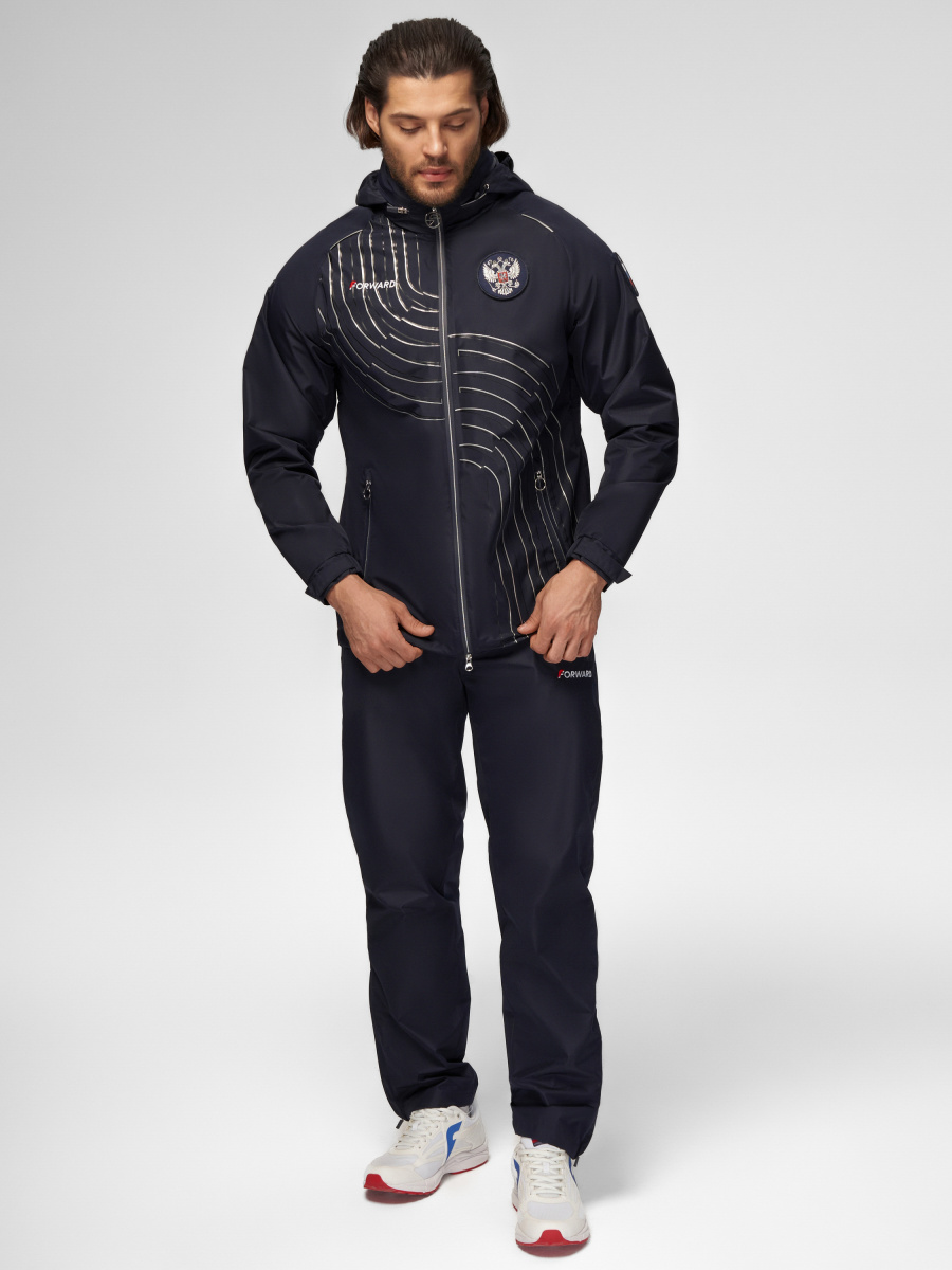 Куртка прямого силуэта на подкладке. Воротник стойка с карманом для капюшона на молнии. Полочка с центральной застежкой молнией. Боковые карманы прорезные с застежкой молнией. Рукава покроя Реглан с отрезными манжетами на эластичной тесьме и патами. Куртка с вентиляцией в области проймы на молнии. В швах проймы светоотражающие элементы. Низ изделия с эластичным шнуром и фиксаторами. Нанесения на куртке: Жаккардовый шеврон «Герб РФ», жаккардовый шеврон «Флаг РФ, RUSSIAN NATIONAL TEAM», вышивка «FORWARD», 3D вышивка «F», принт «Трек», принт «Мы вместе. Спорт». Брюки слегка заужены. Боковые карманы прорезные на молнии. На задних половинках брюк, под коленями, светоотражающие элементы. Пояс с эластичной тесьмой. Ширина пояса регулируется шнуром, вложенным внутрь. В боковых швах, по низу брюк выполнены разрезы с тесьмой молнией, шнуром и фиксаторами. Нанесения брюки: Вышивка «FORWARD», принт «Мы вместе. Спорт», принт «Трек». Состав: ткань верха 100% полиэстер, подкладка сетка: 100% полиэстер