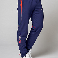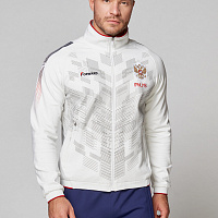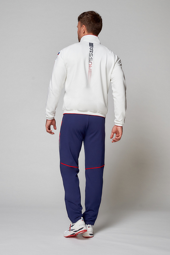 Куртка прямого силуэта на подкладке из сетки. Воротник-стойка выполнен из трикотажного полотна. Полочка с центральной застежкой-молнией. На полочках выполнены боковые карманы с застежкой-молнией. Спинка выполнена с отрезными боковыми деталями, формирующими силуэт изделия. Рукава покроя реглан с отрезными манжетами из трикотажного полотна ластик. Низ изделия с поясом из трикотажного полотна ластик. Нанесения на куртке: жаккардовый шеврон «Герб РФ», жаккардовый шеврон «Флаг РФ, NATIONAL TEAM», принт «RUS», принт «RUSSIA», вышивка «FORWARD», 3D вышивка «F», принт «Пиксельный Орел», декоративный принт. Брюки слегка заужены. Боковые карманы на тесьме-молнии. Брюки имеют боковые вставки с нанесением. Пояс с эластичной тесьмой. Ширина пояса регулируется шнуром, вложенным внутрь. В боковых швах, по низу брюк выполнены разрезы с тесьмой-молнией. Нанесения на брюках: принт «RUSSIA», вышивка «FORWARD», декоративный принт. Куртка прямого силуэта на подкладке из сетки. Воротник стойка выполнен из трикотажного полотна. Полочка с центральной застежкой молнией. На полочках выполнены боковые карманы с застежкой молнией. Спинка выполнена с отрезными боковыми деталями, формирующими силуэт изделия. Рукава покроя Реглан с манжетами из трикотажного полотна ластик. Низ изделия с поясом из трикотажного полотна ластик. Нанесения на куртке: Жаккардовый шеврон «Герб РФ», жаккардовый шеврон «Флаг РФ, NATIONAL TEAM», принт «RUS», принт «RUSSIA», вышивка «FORWARD», 3D вышивка «F», принт «Пиксельный Орел», декоративный принт. Брюки слегка заужены. Боковые карманы на тесьме молнии. Боковые вставки с нанесением. Пояс с эластичной тесьмой. Ширина пояса регулируется шнуром, вложенным внутрь. В боковых швах, по низу брюк выполнены разрезы с тесьмой молнией. Нанесения брюки: Принт «RUSSIA», вышивка «FORWARD», декоративный принт. Состав: ткань верха 100% полиэстер, 250 г/м², подкладка сетка: 100% полиэстер.