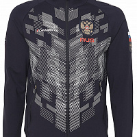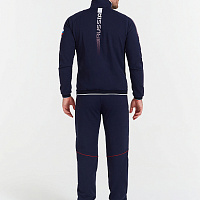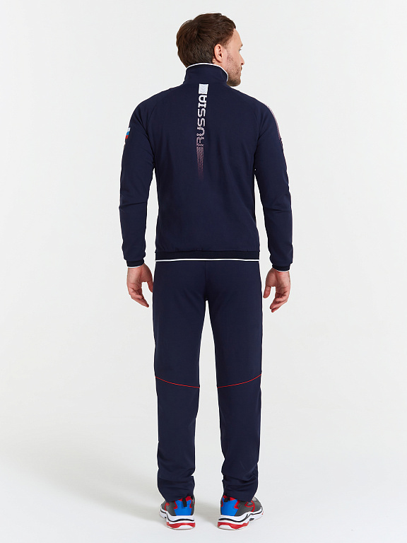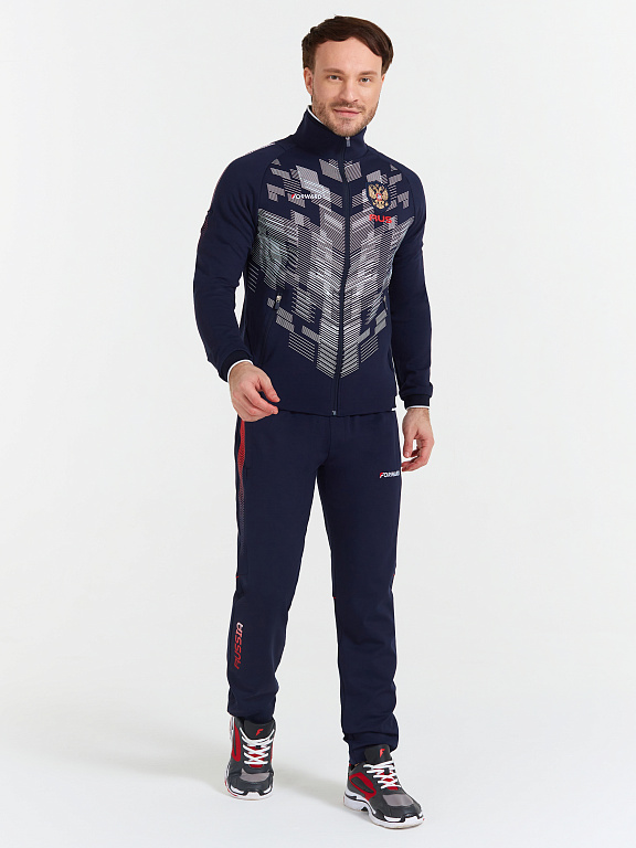 Куртка прямого силуэта на подкладке из сетки. Воротник-стойка выполнен из трикотажного полотна. Полочка с центральной застежкой-молнией. На полочках выполнены боковые карманы с застежкой-молнией. Спинка выполнена с отрезными боковыми деталями, формирующими силуэт изделия. Рукава покроя реглан с отрезными манжетами из трикотажного полотна ластик. Низ изделия с поясом из трикотажного полотна ластик. Нанесения на куртке: жаккардовый шеврон «Герб РФ», жаккардовый шеврон «Флаг РФ, NATIONAL TEAM», принт «RUS», принт «RUSSIA», вышивка «FORWARD», 3D вышивка «F», принт «Пиксельный Орел», декоративный принт. Брюки слегка заужены. Боковые карманы на тесьме-молнии. Брюки имеют боковые вставки с нанесением. Пояс с эластичной тесьмой. Ширина пояса регулируется шнуром, вложенным внутрь. В боковых швах, по низу брюк выполнены разрезы с тесьмой-молнией. Нанесения на брюках: принт «RUSSIA», вышивка «FORWARD», декоративный принт. Куртка прямого силуэта на подкладке из сетки. Воротник стойка выполнен из трикотажного полотна. Полочка с центральной застежкой молнией. На полочках выполнены боковые карманы с застежкой молнией. Спинка выполнена с отрезными боковыми деталями, формирующими силуэт изделия. Рукава покроя Реглан с манжетами из трикотажного полотна ластик. Низ изделия с поясом из трикотажного полотна ластик. Нанесения на куртке: Жаккардовый шеврон «Герб РФ», жаккардовый шеврон «Флаг РФ, NATIONAL TEAM», принт «RUS», принт «RUSSIA», вышивка «FORWARD», 3D вышивка «F», принт «Пиксельный Орел», декоративный принт. Брюки слегка заужены. Боковые карманы на тесьме молнии. Боковые вставки с нанесением. Пояс с эластичной тесьмой. Ширина пояса регулируется шнуром, вложенным внутрь. В боковых швах, по низу брюк выполнены разрезы с тесьмой молнией. Нанесения брюки: Принт «RUSSIA», вышивка «FORWARD», декоративный принт. Состав: ткань верха 66% вискоза, 29% нейлон, 5% эластан, 350 г/м², подкладка сетка: 100% полиэстер.