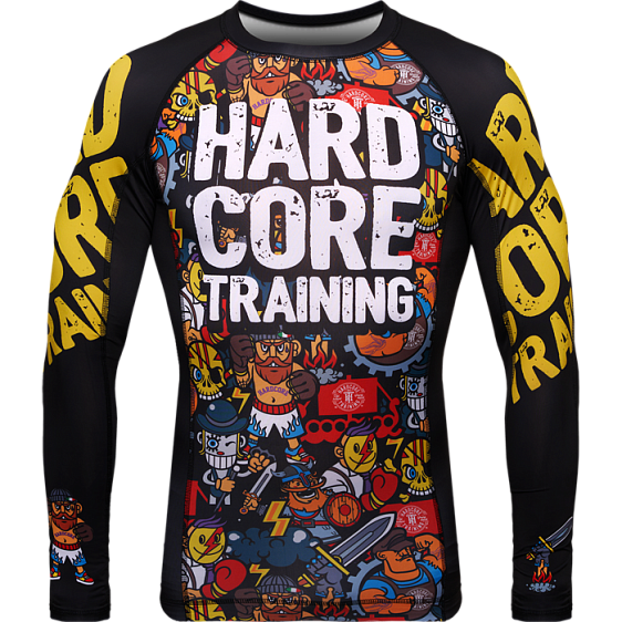Рашгард Hardcore Training Doodles LS. В детстве босоногом наклейки-татуировки из упаковок с жевательной резинкой считались шиком. Сейчас татуировки настоящие, но любовь к стикерам и наклейкам осталась, а детство по-прежнему регулярно играет в одном месте. Моднейший рашгард от НСТ "Doodles" - меняй себя, но не изменяй себе. Основные качественные характеристики рашгарда Hardcore Training: Дышащая эластичная ткань. Сублимированный в ткань рисунок, который не сотрётся и не потеряет свои яркие краски. Быстро сохнет после стирки. Защищает кожный покров от возможных повреждений (соприкосновение с канвасом татами, жёсткий клинч в спарринге, УФ-излучение при тренировках под палящим Солнцем). Помогает сохранить оптимальную температуру тела в течении тренировки. Визуально улучшает внешний вид атлета. Плоские качественные швы не натирают кожу. Специальная прорезиненная полоса в нижней части экипировки предотвращает сползание или перекручивание. Со временем не теряет форму и технических свойств. Служит дольше и лучше по сравнению с футболками из хлопчатобумажной ткани. Рашгард подходит для кроссфита (CrossFit), ММА (смешанные единоборства), грэпплинга и бразильского джиу джицу, классического и тайского бокса, работы с железом и фитнеса, велоспорта и сёрфинга, для бега по улице и бега с препятствиями. Состав: полиэстер, лайкра. Уход: машинная стирка в холодной воде, деликатный отжим, не допускать соприкосновения с липучками и заклёпками. Условная таблица размеров рашгардов от Hardcore Training. Она не учитывает индивидуальные анатомические особенности спортсмена. Так же надо учитывать, что ткань эластичная. Размер Длина изделия Ширина в груди XS 64-68 39-41 S 65-69 40-42 M 68-72 42-44 L 69-73 44-46 XL 70-74 46-48 XXL 72-76 48-50 XXXL 74-78 50-52 Страна производитель: Италия