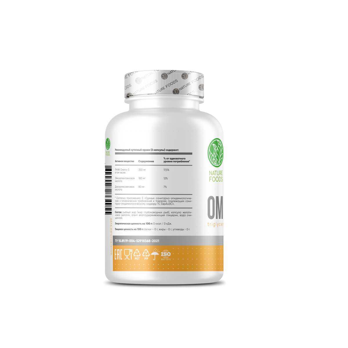 Nature Foods Omega-3 – это полиненасыщенные жирные кислоты, которые являются незаменимыми для нашего организма и поступают только с пищей. В организме преимущественно выполняют структурные функции, входят в состав клеточных мембран клеток каждого органа и тканей. Обеспечивают баланс «хорошего» (Липо Протеиды Высокой Плотности) и «плохого» (Липо Протеиды Низкой Плотности) холестерина. При дефиците Omega 3 в организме наблюдается снижение ЛПВП, что ведет к нарушению транспортировка холестерина по сосудам, в следствии чего он начинает откладываться на стенках мелких, средних и крупных сосудов, образую холестериновые бляшки. Нарушается кровоток. Подобное состояние в дальнейшим приводит к атеросклерозу, который может привести к инфаркту миокарда или инсульту. Так же, Omega 3 входят в состав миелиновой оболочки нервов, которая обеспечивает проводимость электрического сигнала от одной нервной клетки к другой. Полиненасыщенные жирные кислоты должны составлять до половины всех жиров, поступающих в организм. Размер порции: 3 капсулы Количество порций: 80 Состав на одну порцию: Рыбный жир – 1360 мг ПНЖК Омега-3 жирные кислоты – 1050 мг ЭПК (эйкозапентаеновая кислота) – 540 мг ДГК (докозагексаеновая кислота) – 360 мг Рекомендации по приему: ринимать одну порцию (3 капсулы) 1-2 раза в день после еды, в зависимости от рациона питание, массы тела, задач и уровня физической активности.