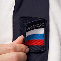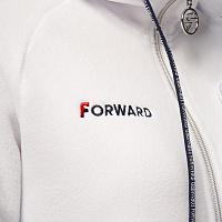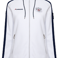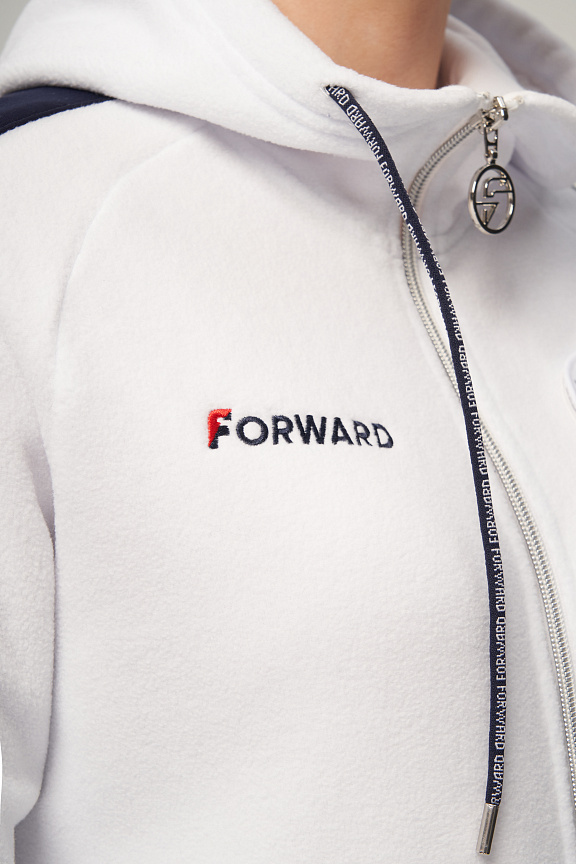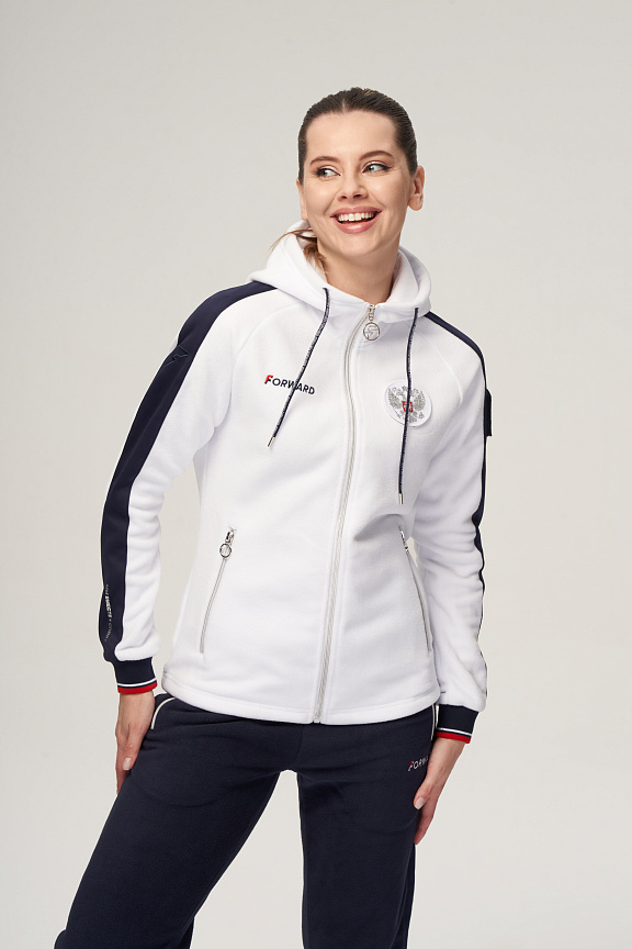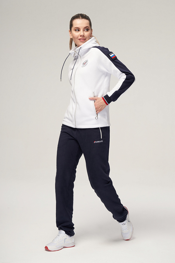 Куртка прямого силуэта с капюшоном. Полочка с центральной застежкой на тесьму молнию. Боковые карманы прорезные обработаны с тесьмой молнией. Капюшон регулируется по высоте с помощью шнурка. Рукава покроя реглан.На рукавах декоративные вставки из ламинированного флиса. Манжеты выполнены из трикотажного полотна ластик. Низ изделия регулируется при помощи эластичного шнура и фиксаторов. Нанесения на куртке: Жаккардовый шеврон «Герб РФ», жаккардовый шеврон«Флаг РФ», вышивка «FORWARD», принт «Мы вместе.спорт» Брюки слегка зауженного к низу силуэта. Боковые карманы прорезные, застегиваются на молнию. Вдоль боковых швов декоративныевставки из ламинированного флиса. Пояс с эластичной тесьмой. Ширина пояса регулируется шнуром, вставленным внутрь. Ширина по низу регулируется при помощи эластичного шнура и фиксаторов. Нанесения на брюках: вышивка «FORWARD». Состав: ткань верха 100% полиэстер 240г/м², флис с двусторонним подчесом, полотно компаньон 100% полиэстер 240г/м², ламинированный флис.
