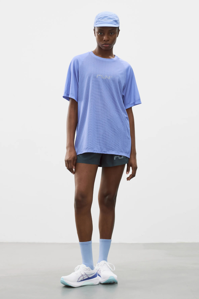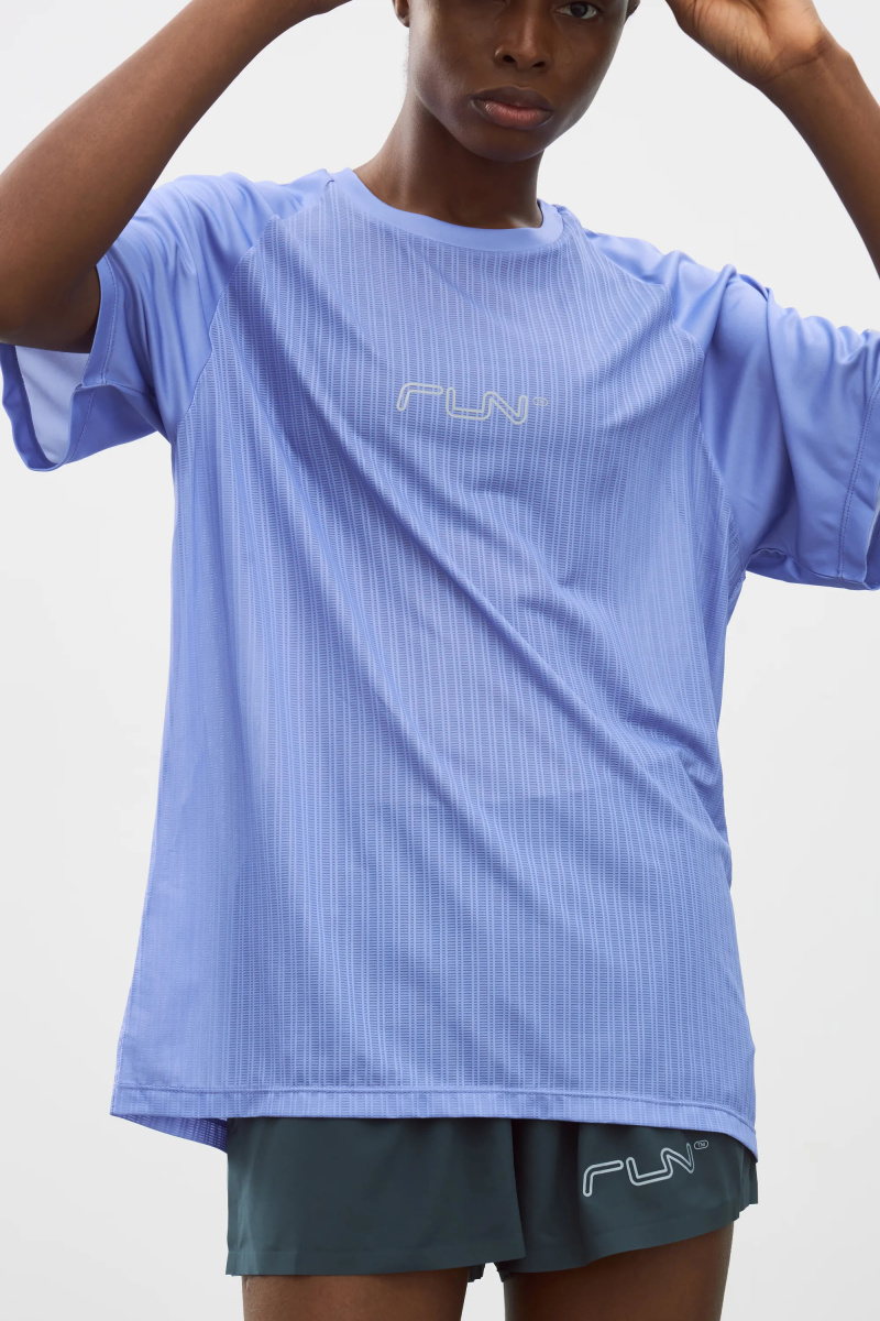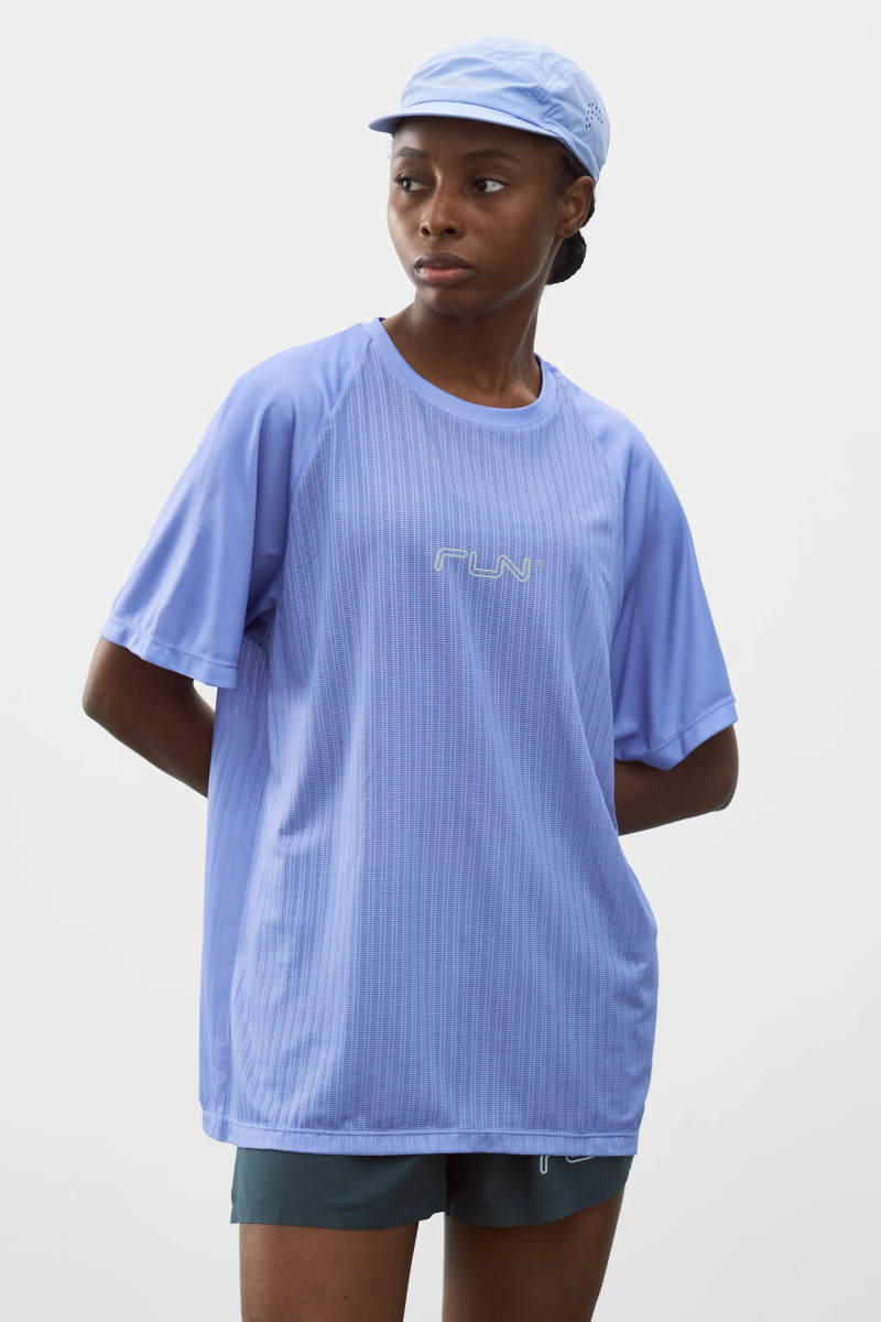 Футболка для бега из комбинированной ткани с рукавами реглан. Легкая модель прямого кроя эффективно выводит лишнюю влагу и сохраняет ощущение комфорта за счет перфорированной структуры основного материала. Фирменные логотипы на груди и рукавах.
