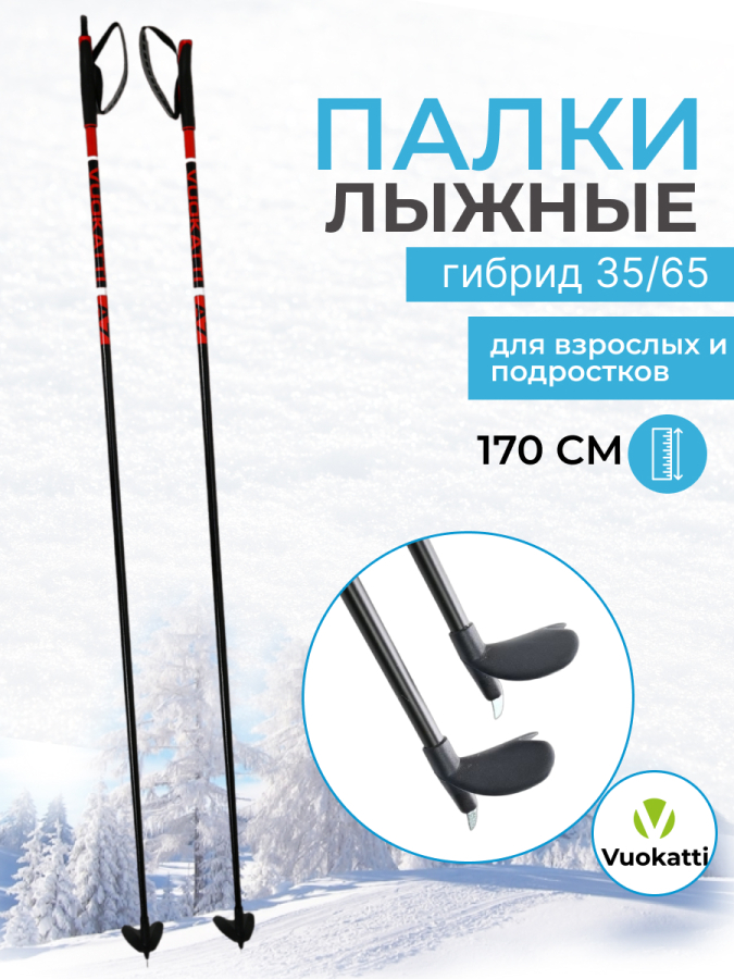 Палки лыжные VUOKATTI гибридные 35/65 предназначены для спортсменов с начальным уровнем подготовки. Состав: 65% стекловолокно (Fiberglass), 35% углеволокно (Carbon). Лыжные палки - легкие, прочные, современные палки лыжные для катания. Они подходят начинающим спортсменам. Модель лыжных палок делает то, что должно делать лыжное снаряжение: экономит энергию. Конструкция из стекловолокна и карбона высшего качества делает их легковесными и прочными для легкого и эффективного передвижения. Усиленный ремешок позволяет передавать большее усилие на ровной поверхности или при подъеме. Палки стоит подбирать на 25-30 см ниже роста для классического хода. И на 15-20 для конькового. Лыжные палки предназначены начинающим спортсменам-любителям, туристам и любителям активного отдыха. Палки лыжные гоночные подойдут для взрослых и подростков. Лёгкие и недорогие лыжные палки VUOKATTI с привлекательным дизайном, для новичков в мире лыжного спорта, любителей активного отдыха и туристов. Длину лыжных палок можно подобрать по таблице соответствия роста лыжника и размера палок.
