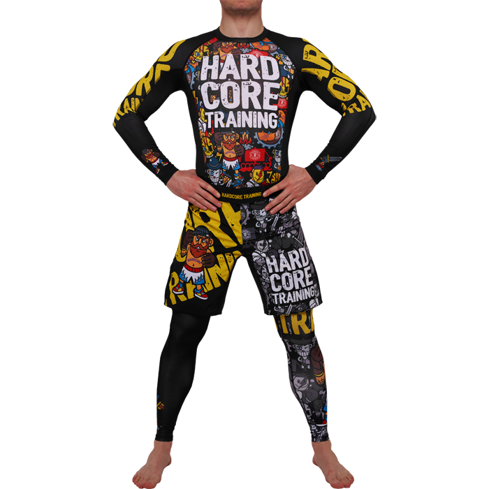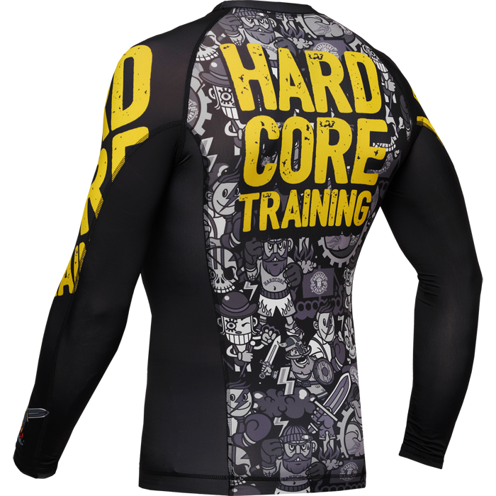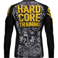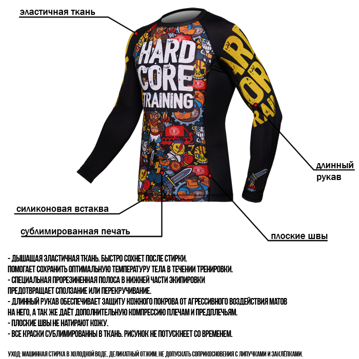 Рашгард Hardcore Training Doodles LS. В детстве босоногом наклейки-татуировки из упаковок с жевательной резинкой считались шиком. Сейчас татуировки настоящие, но любовь к стикерам и наклейкам осталась, а детство по-прежнему регулярно играет в одном месте. Моднейший рашгард от НСТ "Doodles" - меняй себя, но не изменяй себе. Основные качественные характеристики рашгарда Hardcore Training: Дышащая эластичная ткань. Сублимированный в ткань рисунок, который не сотрётся и не потеряет свои яркие краски. Быстро сохнет после стирки. Защищает кожный покров от возможных повреждений (соприкосновение с канвасом татами, жёсткий клинч в спарринге, УФ-излучение при тренировках под палящим Солнцем). Помогает сохранить оптимальную температуру тела в течении тренировки. Визуально улучшает внешний вид атлета. Плоские качественные швы не натирают кожу. Специальная прорезиненная полоса в нижней части экипировки предотвращает сползание или перекручивание. Со временем не теряет форму и технических свойств. Служит дольше и лучше по сравнению с футболками из хлопчатобумажной ткани. Рашгард подходит для кроссфита (CrossFit), ММА (смешанные единоборства), грэпплинга и бразильского джиу джицу, классического и тайского бокса, работы с железом и фитнеса, велоспорта и сёрфинга, для бега по улице и бега с препятствиями. Состав: полиэстер, лайкра. Уход: машинная стирка в холодной воде, деликатный отжим, не допускать соприкосновения с липучками и заклёпками. Условная таблица размеров рашгардов от Hardcore Training. Она не учитывает индивидуальные анатомические особенности спортсмена. Так же надо учитывать, что ткань эластичная. Размер Длина изделия Ширина в груди XS 64-68 39-41 S 65-69 40-42 M 68-72 42-44 L 69-73 44-46 XL 70-74 46-48 XXL 72-76 48-50 XXXL 74-78 50-52 Страна производитель: Италия
