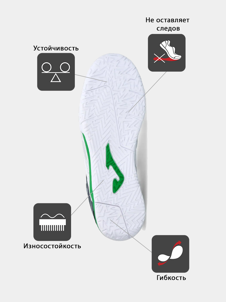 Joma Dribling, футзалки, верх которых изготовлен из прочного и гибкого синтетического материала Fibertec (искусственная кожа). Боковые части выполнены из сетчатого текстиля, отвечающего за доступ воздуха. Мягкий текстильный материал применен во внутренней части верха. В области носка в материале также имеются вентиляционные отверстия (система VTS), благодаря которым стопа игрока все время матча или тренировки остается сухой. Усиленная пятка и носок защищают от повреждений. Дополнительный защитный элемент в носочной области помогает наносить сильные удары по мячу. Подошва DRIBLING выполнена из износостойкой резины (технология DURABILITY) , обеспечивающей отличный контракт с игровой поверхностью. Точка разворота ROTATION помогает легко и без риска травмы изменять направление движения на паркете. Линии FLEXO делают футзалки гибкими и способствуют естественному движению стопы по время бега. Технология PERFECT FIT, используемая в зоне шнуровки, обеспечивает оптимальную посадку кроссовок.