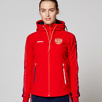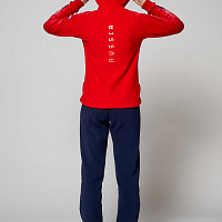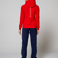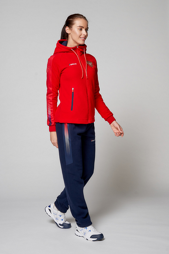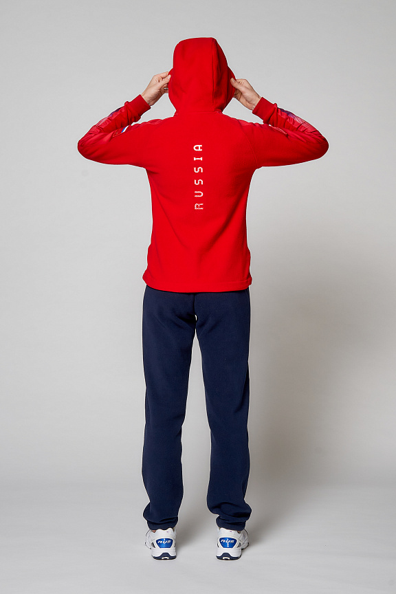 Куртка полуприлегающего силуэта с капюшоном. Полочка с центральной застежкой на тесьму молнию. Боковые карманы прорезные обработаны с тесьмой молнией. Капюшон регулируется по высоте с помощью шнурка. Рукава комбинированного покроя. Вставки рукавов, выполнены из ткани компаньона. Манжеты выполнены из трикотажного полотна ластик. Низ изделия регулируется при помощи эластичного шнура и фиксаторов. Нанесения на куртке: Жаккардовый шеврон «Герб РФ», шеврон «Флаг РФ+NATIONAL TEAM», вышивка «FORWARD», 3D вышивка «F», аппликативная вышивка «RUSSIA», фирменный принт. Брюки слегка зауженного к низу силуэта, с боковыми вставками из полотна компаньона. Боковые карманы, застегиваются на молнию. Пояс с эластичной тесьмой. Ширина пояса регулируется шнуром, вставленным внутрь. Ширина по низу регулируется при помощи эластичного шнура и фиксаторов. Нанесения на брюках: вышивка «FORWARD», фирменный принт. Состав: ткань верха 100% полиэстер 240г/м², флис с двусторонним подчесом, 100% полиэстер 240г/м², флис с ламинацией.