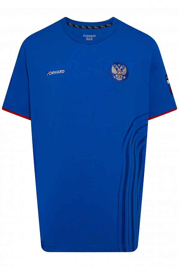 Футболка прямого силуэта с О-образным вырезом горловины. Обтачка горловины выполнена комбинированная из трикотажного полотна ластик . Рукав покроя реглан с принтованной вставкой по центру. Спинка выполнена из полотна компаньона - ложная сетка. Нанесения: Жаккардовый шеврон «Герб РФ», жаккардовый шеврон «Флаг РФ», принт «РОССИЯ Мы вместе. Спорт», вышивка «FORWARD», 3D вышивка «F», принт «Трек». Состав: 100% полиэстер 145gr/m², полотно компаньон ложная сетка 100% полиэстер 145gr/m².