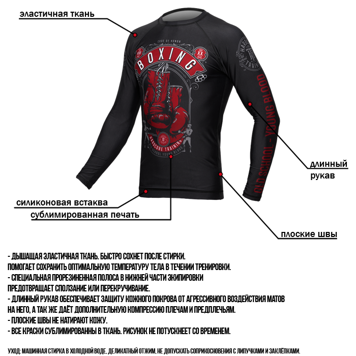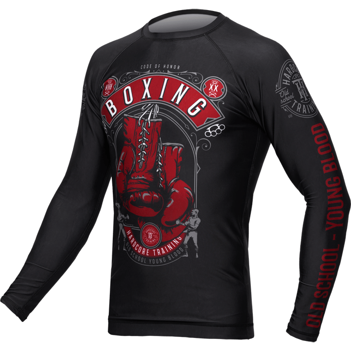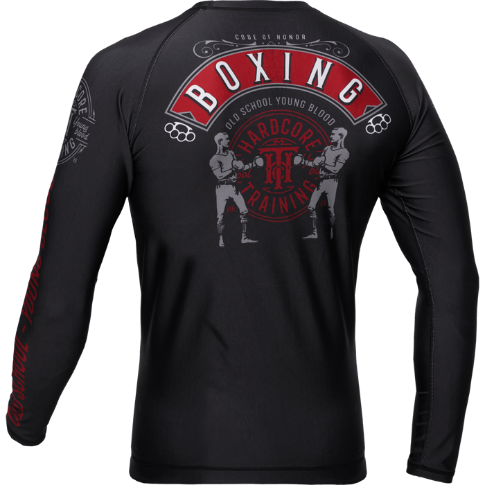 Рашгард Hardcore Training Code Of Honor LS. Очередной реверанс от НСТ в сторону одной из благороднейших джентельменских тем. Несмотря на «старость», бокс не теряет популярности, упорно держит позиции, отказывается уходить на свалку истории. Испытанный метод выгнать дурь из своей головы и выбить из чужой. Дышащая эластичная ткань. Быстро сохнет после стирки. Длинный рукав обеспечивает защиту кожного покрова от агрессивного воздействия матов (татами) на него, а так же даёт дополнительную компрессию плечам и предплечьям. Помогает сохранить оптимальную температуру тела в течении тренировки. Специальная прорезиненная полоса в нижней части экипировки предотвращает сползание или перекручивание. Рашгард подходит для кроссфита, мма, грэпплинга, классического и тайского бокса, работы с железом и фитнеса. Состав: полиэстер, эластан. Уход: машинная стирка в холодной воде, деликатный отжим, не допускать соприкосновения с липучками и заклёпками. Страна производитель: Италия