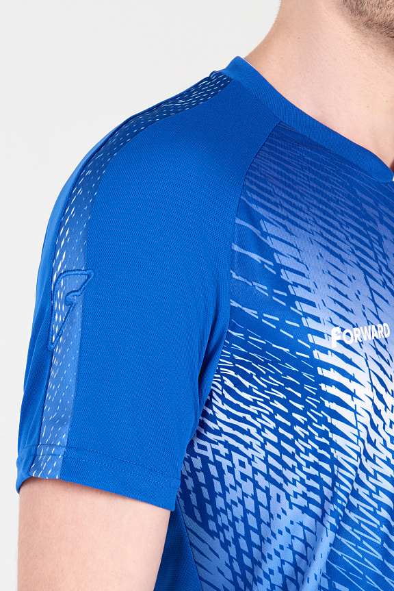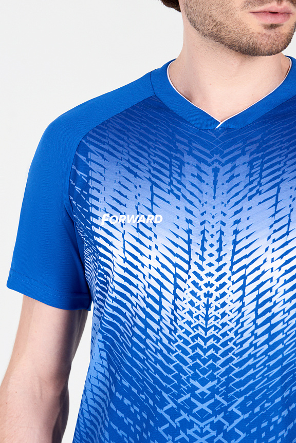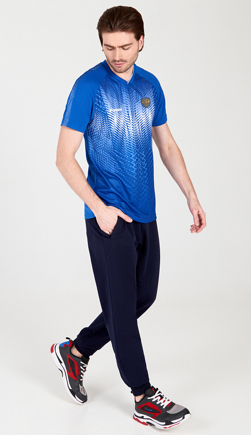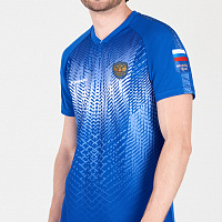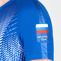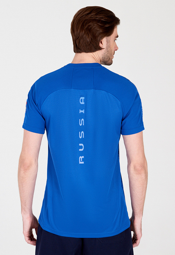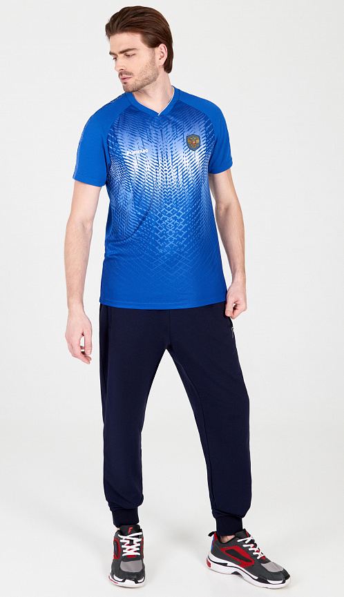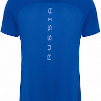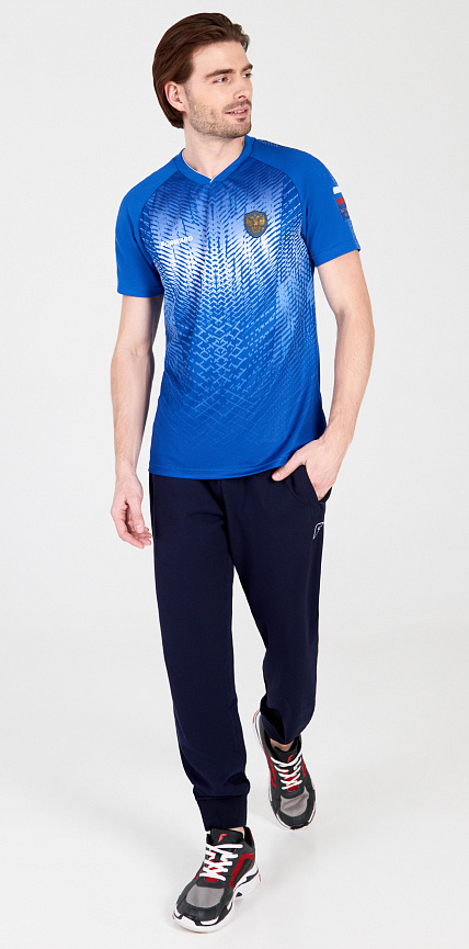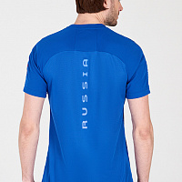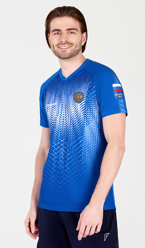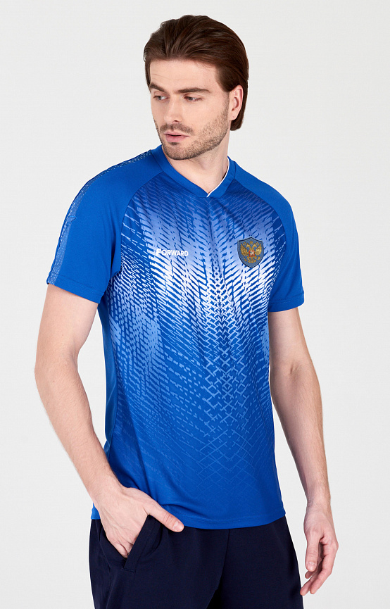 Мужская футболка с коротким рукавом. Футболка прямого силуэта с V-образным вырезом горловины. Обтачка горловины выполнена из основного полотна. Рукав покроя реглан. Полочка запринтованная. Спинка и плечевые вставки выполнены из сетчатого полотна. Нанесения: жаккардовый шеврон «Герб РФ», жаккардовый шеврон «Флаг РФ, NATIONAL TEAM», принт «RUSSIA», вышивка «FORWARD», 3D вышивка «F», декоративный принт. Футболка отлично отводит влагу и великолепно подходит для занятий спортом. Состав: 100% полиэстер, 135-145 г/м². Футболка прямого силуэта с V-образным вырезом горловины. Обтачка горловины выполнена из основного полотна. Рукав покроя реглан. Полочка запринтованая. Спинка и плечевые вставки выполнены из сетчатого полотна. Нанесения: Жаккардовый шеврон «Герб РФ», жаккардовый шеврон «Флаг РФ, NATIONAL TEAM», принт «RUSSIA», вышивка «FORWARD», 3D вышивка «F», декоративный принт. Состав: 100% полиэстер, 135-145г/м2.