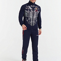 Куртка прямого силуэта на подкладке из сетки. Воротник-стойка выполнен из трикотажного полотна. Полочка с центральной застежкой-молнией. На полочках выполнены боковые карманы с застежкой-молнией. Спинка выполнена с отрезными боковыми деталями, формирующими силуэт изделия. Рукава покроя реглан с отрезными манжетами из трикотажного полотна ластик. Низ изделия с поясом из трикотажного полотна ластик. Нанесения на куртке: жаккардовый шеврон «Герб РФ», жаккардовый шеврон «Флаг РФ, NATIONAL TEAM», принт «RUS», принт «RUSSIA», вышивка «FORWARD», 3D вышивка «F», принт «Пиксельный Орел», декоративный принт. Брюки слегка заужены. Боковые карманы на тесьме-молнии. Брюки имеют боковые вставки с нанесением. Пояс с эластичной тесьмой. Ширина пояса регулируется шнуром, вложенным внутрь. В боковых швах, по низу брюк выполнены разрезы с тесьмой-молнией. Нанесения на брюках: принт «RUSSIA», вышивка «FORWARD», декоративный принт. Куртка прямого силуэта на подкладке из сетки. Воротник стойка выполнен из трикотажного полотна. Полочка с центральной застежкой молнией. На полочках выполнены боковые карманы с застежкой молнией. Спинка выполнена с отрезными боковыми деталями, формирующими силуэт изделия. Рукава покроя Реглан с манжетами из трикотажного полотна ластик. Низ изделия с поясом из трикотажного полотна ластик. Нанесения на куртке: Жаккардовый шеврон «Герб РФ», жаккардовый шеврон «Флаг РФ, NATIONAL TEAM», принт «RUS», принт «RUSSIA», вышивка «FORWARD», 3D вышивка «F», принт «Пиксельный Орел», декоративный принт. Брюки слегка заужены. Боковые карманы на тесьме молнии. Боковые вставки с нанесением. Пояс с эластичной тесьмой. Ширина пояса регулируется шнуром, вложенным внутрь. В боковых швах, по низу брюк выполнены разрезы с тесьмой молнией. Нанесения брюки: Принт «RUSSIA», вышивка «FORWARD», декоративный принт. Состав: ткань верха 66% вискоза, 29% нейлон, 5% эластан, 350 г/м², подкладка сетка: 100% полиэстер.