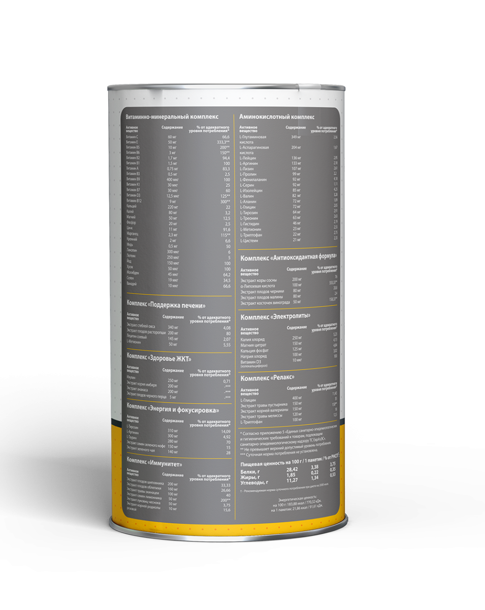Комплексная пищевая добавка «Multivit Рack» («Мультивит Пак») Не является БАДом и лекарственным средством. Описание: сбалансированная витаминно-минеральная добавка, восполняющая дневную потребность организма в макро- и микронутриентах. Обеспечивает общее укрепление здоровья, увеличивает прирост сухой мышечной массы, способствует снижению объемов жировой массы, увеличивает энергетические запасы организма и сокращает период восстановления после физических нагрузок. Форма выпуска: 30 пакетиков. Рекомендации по применению: взрослым принимать по 1 пакетику 1 раз в день во время приема пищи или в соответствии с вашей индивидуальной программой питания или рекомендациями врача. Противопоказания: индивидуальная непереносимость компонентов, беременность, кормление грудью. Продукт не рекомендуется принимать лицам до 18 лет. Перед применением проконсультируйтесь со специалистом. Условия хранения: хранить в сухом, хорошо проветриваемом, недоступном для детей месте при температуре от +5°С до +25°С и относительной влажности воздуха не более 75%. Срок годности продукта в закрытой упаковке 24 месяца. Дата изготовления и номер партии указаны на упаковке. Не использовать после истечения срока годности. Состав: Витаминно-минеральный комплекс (таблетка синего цвета): кальция карбонат, магния оксид, калия фосфат, натрия фосфат, витамин С (аскорбиновая кислота), железа карбонат, витамин Е (D-альфа токоферола ацетат), витамин В5 (D-пантотенат кальция), витамин РР (ниацин), цинка оксид, калия йодид, натрия молибдат, марганца сульфат, кремния диоксид, витамин В6 (пиридоксина гидрохлорид), меди сульфат, витамин В2 (рибофлавин), витамин В1 (тиамина мононитрат), витамин А (ретинола ацетат, бета-каротин), селенометионин, витамин В9 (фолиевая кислота), хрома пиколинат, ванадия аспартат, витамин К1 (фитоменадион), биотин, витамин D3 (холекальциферол), витамин В12 (цианокобаламин), наполнитель - микрокристаллическая целлюлоза, оболочка таблетки - гидроксипропилметилцеллюлоза, связывающие вещества - поливиниловый спирт, полидекстроза; пластификатор - полиэтиленгликоль, краситель - диоксид титана, антислеживающие агенты - тальк, стеарат магния, разрыхлитель - кроскарамеллоза. Аминокислотный комплекс (таблетка кремового цвета): L-глутаминовая кислота, L-аспарагиновая кислота, L-лейцин, L-аргинин, L-лизин, L-пролин, L-фенилаланин, L-серин, L-изолейцин, L-валин, L-аланин, L-глицин, L-треонин, L-тирозин, L-гистидин, L-метионин, L-триптофан, L-цистеин, наполнители - микрокристаллическая целлюлоза, крахмал; разрыхлитель – тальк; антислеживающие агенты - стеариновая кислота, диоксид кремния. Комплекс «Поддержка печени» (таблетка коричневого цвета): экстракт стеблей овса, экстракт плодов расторопши, соевый лецитин, L-метионин, наполнители - микрокристаллическая целлюлоза, крахмал; разрыхлитель – тальк; антислеживающие агенты - стеариновая кислота, диоксид кремния. Комплекс «Здоровье ЖКТ» (таблетка желтого цвета): инулин, экстракт корня имбиря, экстракт ананаса, экстракт плодов черного перца, наполнители - микрокристаллическая целлюлоза, крахмал; разрыхлитель – тальк; антислеживающие агенты - стеариновая кислота, диоксид кремния. Комплекс «Энергия и фокус» (таблетка красного цвета): L-тирозин, L-аргинин, L-таурин, экстракт семян зеленого кофе, экстракт зеленого чая, наполнители - микрокристалличе