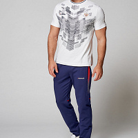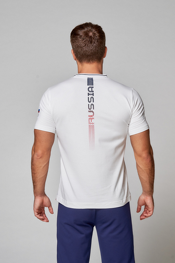 Футболка прямого силуэта, с О-образным вырезом горловины. Обтачка горловины выполнена из трикотажного полотна ластик. Рукав втачной. По бокам выполнены разрезы с принтованной вставкой. Нанесения: жаккардовый шеврон «Герб РФ», жаккардовый шеврон «Флаг РФ, NATIONAL TEAM», принт «RUSSIA», вышивка «FORWARD», 3D вышивка «F», принт «Пиксельный Орел», декоративный принт. Состав: 95% хлопок, 5% эластан, 180г/м².