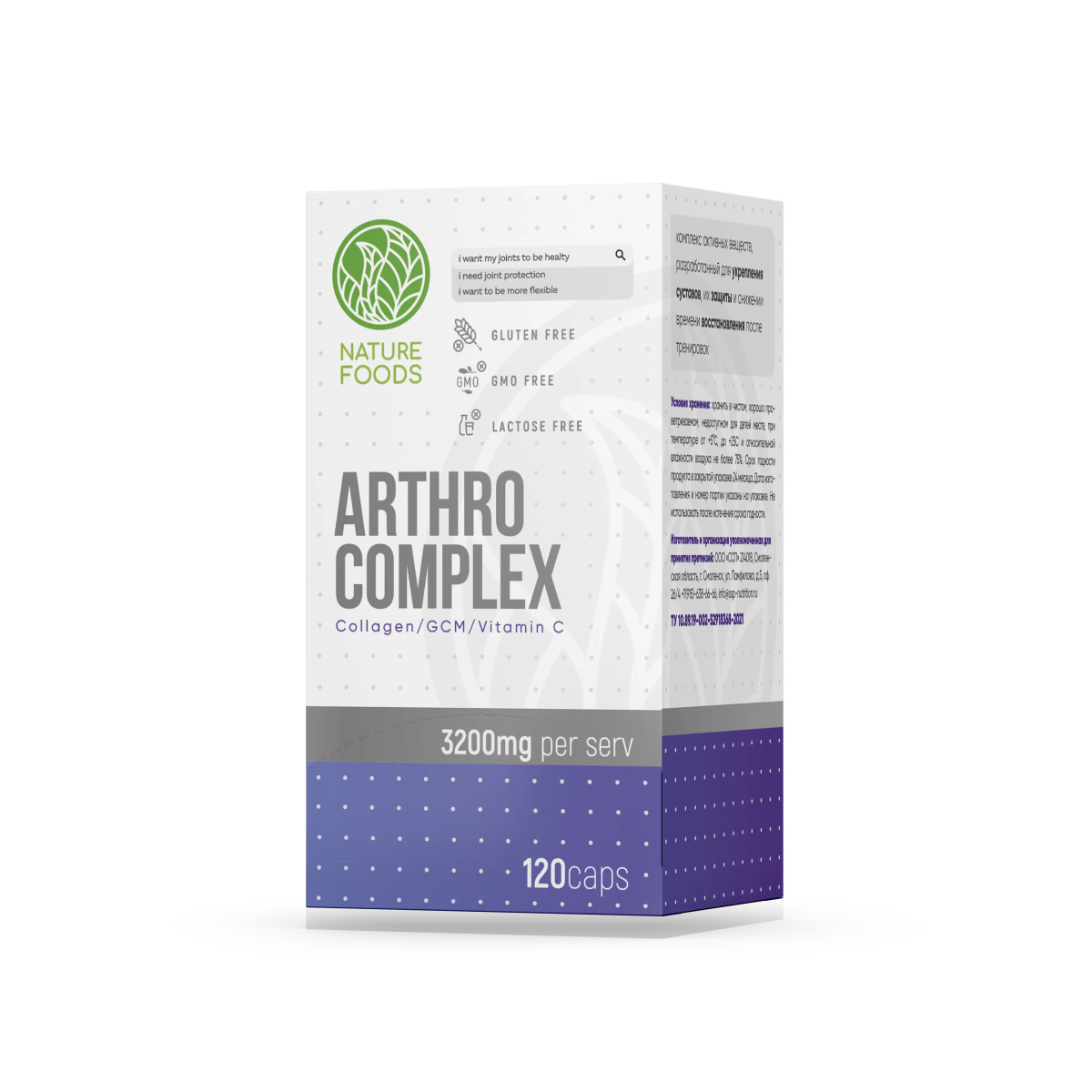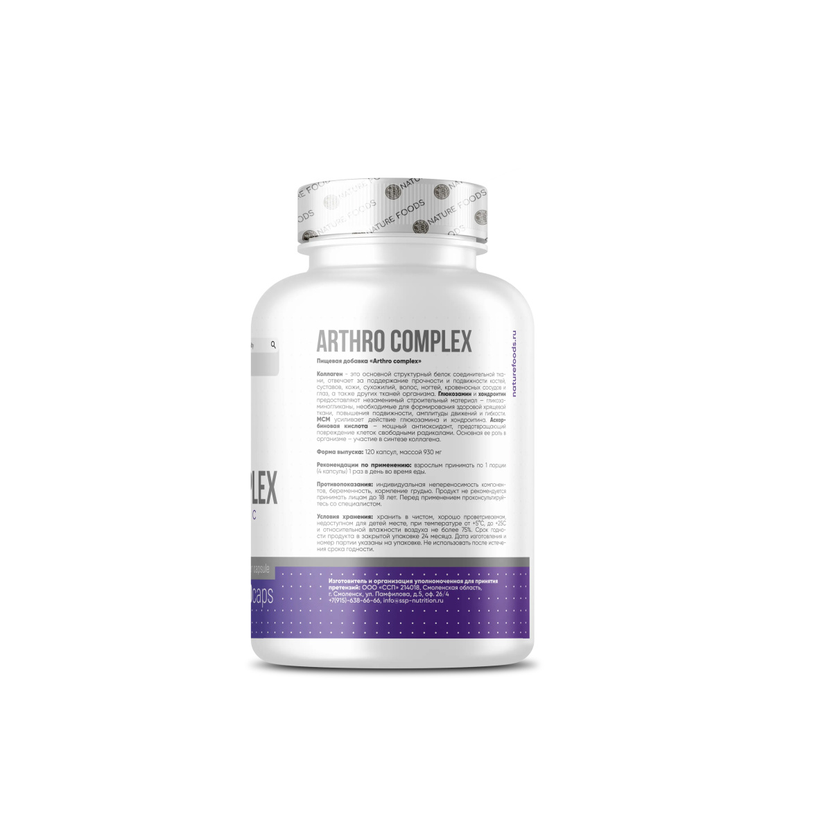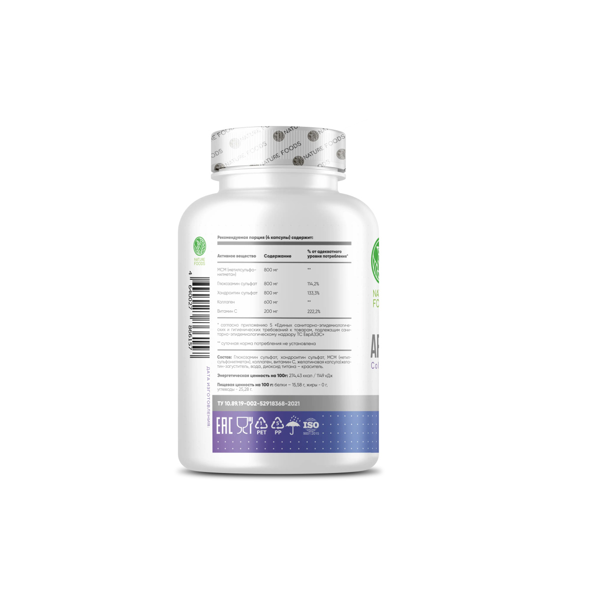Nature Foods Arthro Complex – это комплексная добавка для защиты и поддержания суставо-связочного аппарата. Обеспечивает, прежде всего, питание и восстановление хрящевой ткани. Нормализует состав и количество синовиальной (внутрисуставной) жидкости. Стимулирует образование собственного коллагена в костях и соединительной ткани. Благодаря наличию в составе коллагена, Nature Foods Arthro Complex питает и укрепляет связки, а также способствует повышению упругости кожи. МСМ и глюкозамина сульфат стимулирует синтез хондроитина – главного элементы хрящей. Nature Foods Arthro Complex показан при различных нарушениях, связанных с опорно-двигательным аппаратом. Служит отличной профилактикой спортивных, производственных и бытовых травм. Возможен прием как для профилактики, так и в совокупности с комплексным лечением. Размер порции: 4 капсулы Количество порций: 30 Состав на одну порцию: МСМ (метилсульфонилметан) – 800мг Глюкозамин сульфат – 800мг Хондроитин сульфат – 800мг Коллаген – 600мг Витамин С – 200мг Рекомендации по приему: Принимать одну порцию в день (4 капсулы) после еды. Можно разделить на два приема по 2 капсулы, утром и вечером после еды. Возможно увеличение дневной дозировки по рекомендации врача.